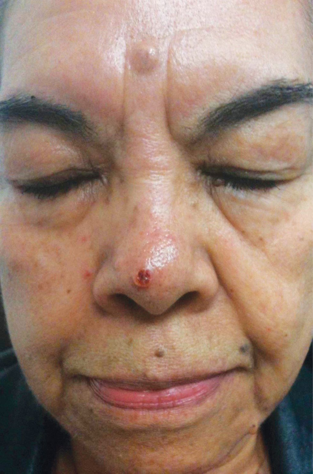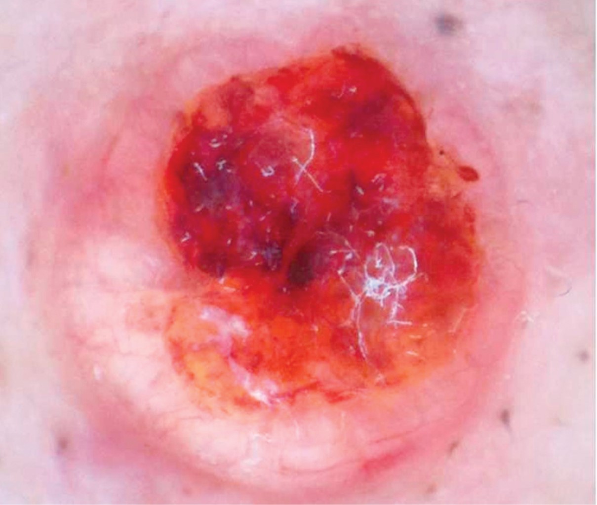 Mujer de 76 años con dermatosis localizada a la punta nasal, constituida por una neoformación hemiesférica, bien circunscrita, de 9 mm de diámetro, de superficie eritematosa, ulcerada, con bordes del color de la piel y telangiectasias (Figura 4). A la dermatoscopía se observan áreas rojo-vinosas mal definidas que alternan con áreas amarillentas sin estructura característica, costra y ulceración en el centro y vasos arborescentes en la periferia (Figura 5). Un año de evolución, con crecimiento en los últimos tres meses, con leve prurito y sangrado ocasional.
