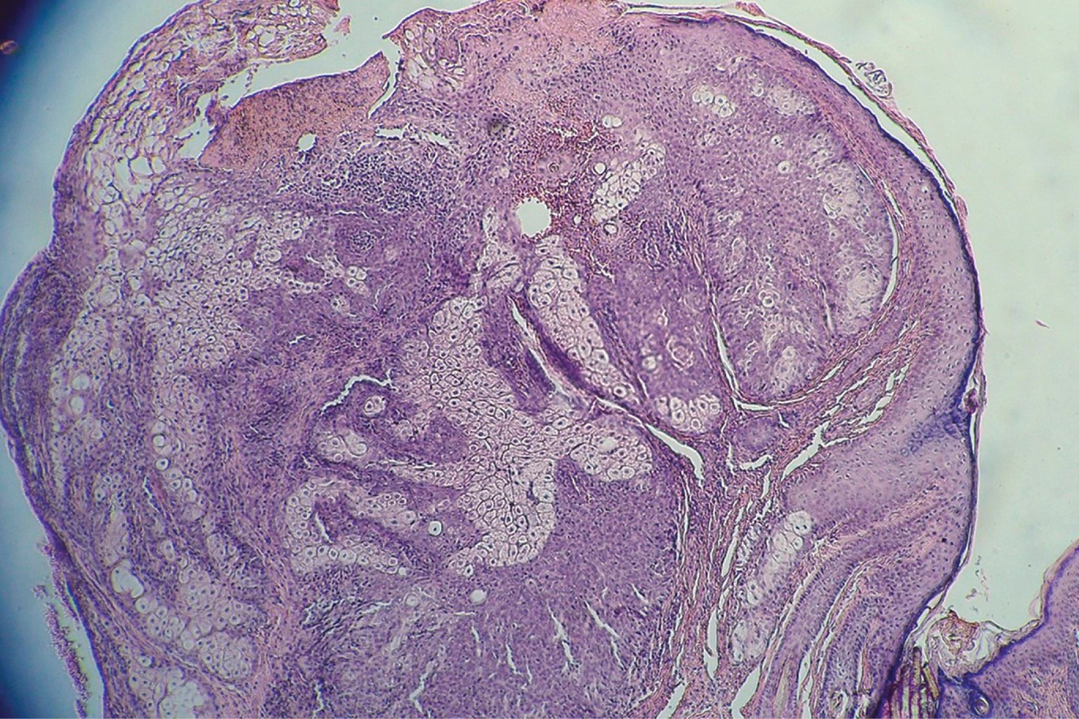 Se realiza biopsia incisional que reporta neoformación ligeramente exofítica cuya epidermis presenta escasa capa córnea y acantosis irregular moderada, por debajo de ésta se observan numerosos cordones de células basaloides que se entremezclan con tejido sebáceo maduro en proporciones iguales, rodeados por escasa reacción inflamatoria. Con lo anterior se integra el diagnóstico de sebaceoma (Figuras 6 y 7). En un segundo tiempo se realiza extirpación completa de la misma.