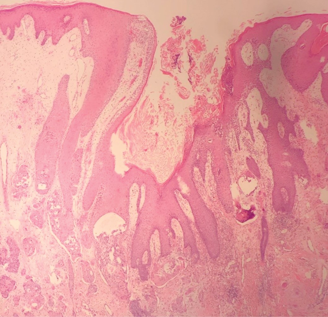 La dermis intermedia puede contener un infiltrado celular inflamatorio crónico que incluye linfocitos, histiocitos y células plasmáticas. Se ha descrito la presencia de un cuerno cutáneo suprayacente.8,9