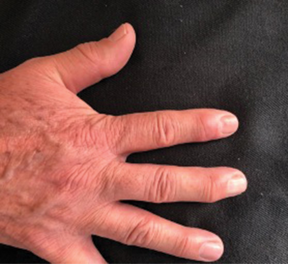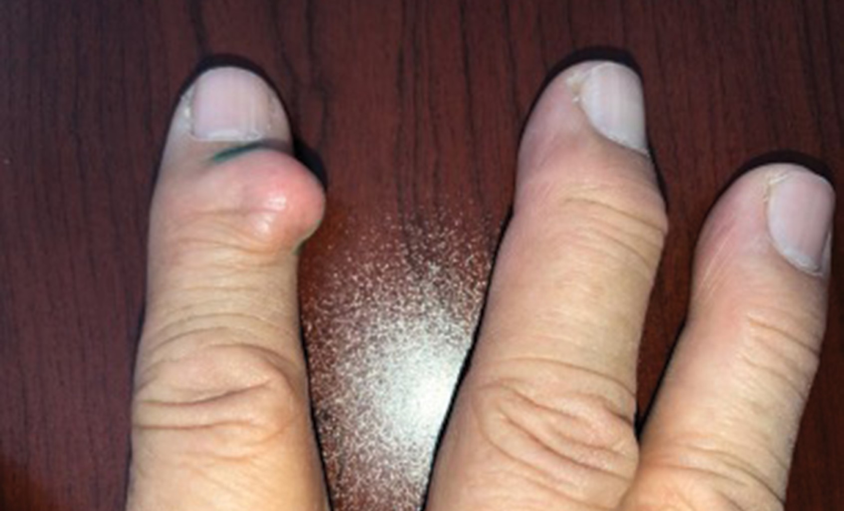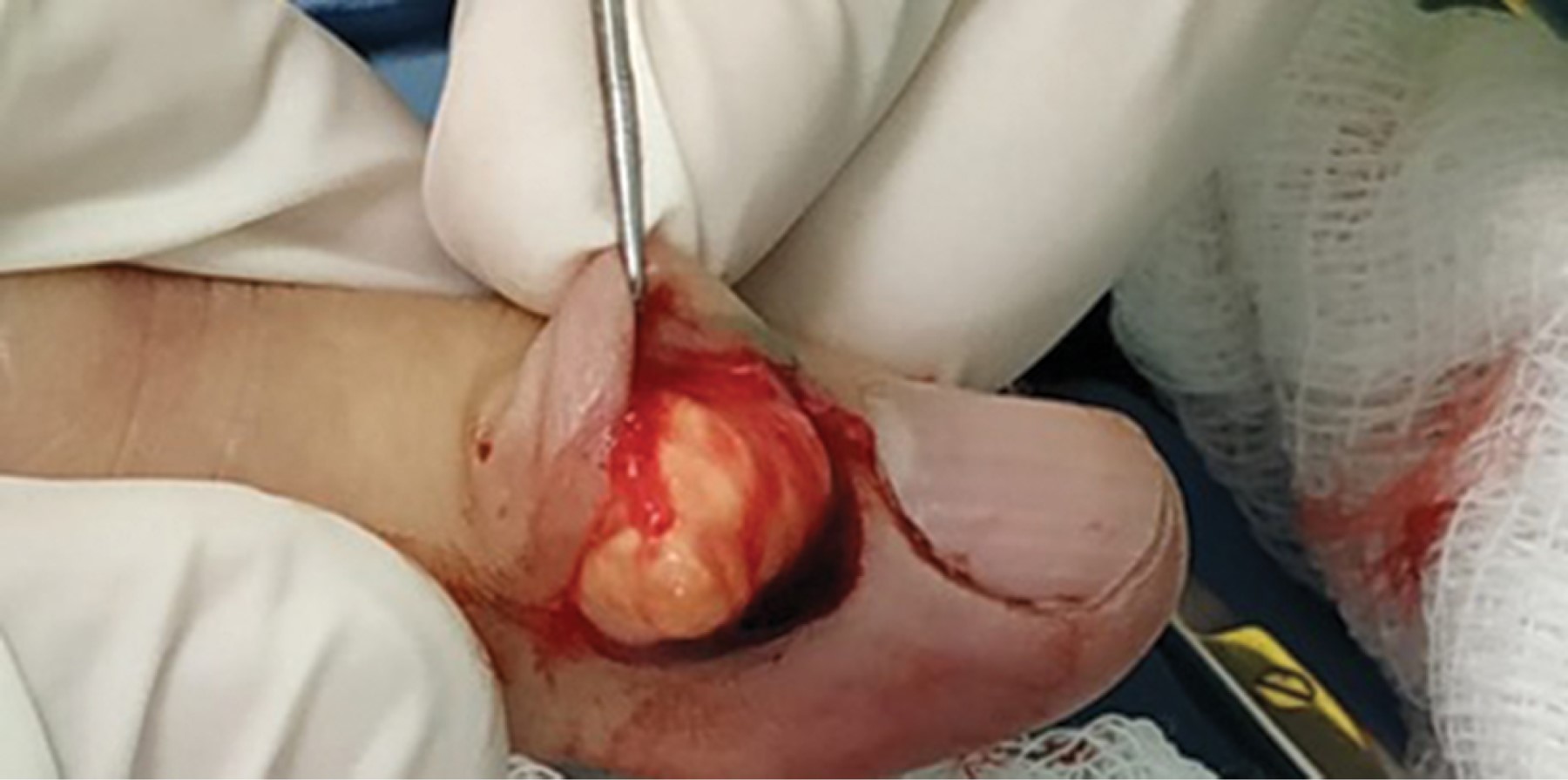 Paciente del sexo masculino, de 68 años, originario y residente de la Ciudad de México, acude por presentar una tumoración en el dedo índice de la mano derecha que ha ido aumentando de tamaño en los últimos dos años, causando imposibilidad para ejecutar sus actividades manuales. Niega antecedente de traumatismos previos, así como manipulación de la lesión. A la exploración física se observa dermatosis localizada a la extremidad superior derecha, de la cual afecta mano y de ésta el dedo índice en su cara dorsal, en el tercio distal, a nivel de la articulación interfalángica distal. La dermatosis estaba constituida por una neoformación subcutánea de aproximadamente 2 centímetros de diámetro, de aspecto lobulado, del color de la piel, con eritema en el centro, móvil, no adherida a planos profundos, de consistencia firme, y de bordes bien definidos (Figura 1).
