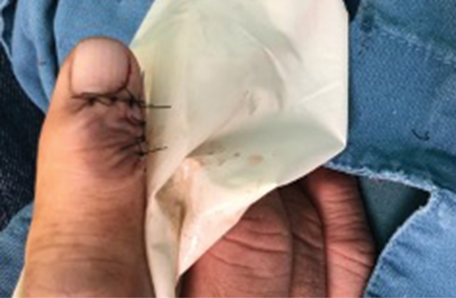 Se solicita radiografía de mano derecha, en la cual se observa radiolucidez circunscrita a nivel de articulación interfalángica distal. Durante la exploración quirúrgica, al extirpar la lesión, se obtiene una neoformación de color amarillo, lobulada, de consistencia firme, superficie aperlada, de bordes bien definidos (Figura 2). Se efectúa reconstrucción mediante colgajo de avance en "L", sin complicaciones (Figura 3). En la histopatología se observa una tumoración circunscrita constituida por numerosas células de aspecto fusiforme y epitelioide que forman haces muy compactos, así como formación de numerosas células gigantes multinucleadas de tipo osteoclasto (Figura 4). El paciente evolucionó en forma favorable, con adecuada cicatrización de la herida, y sin recidivas hasta el momento (Figura 5).