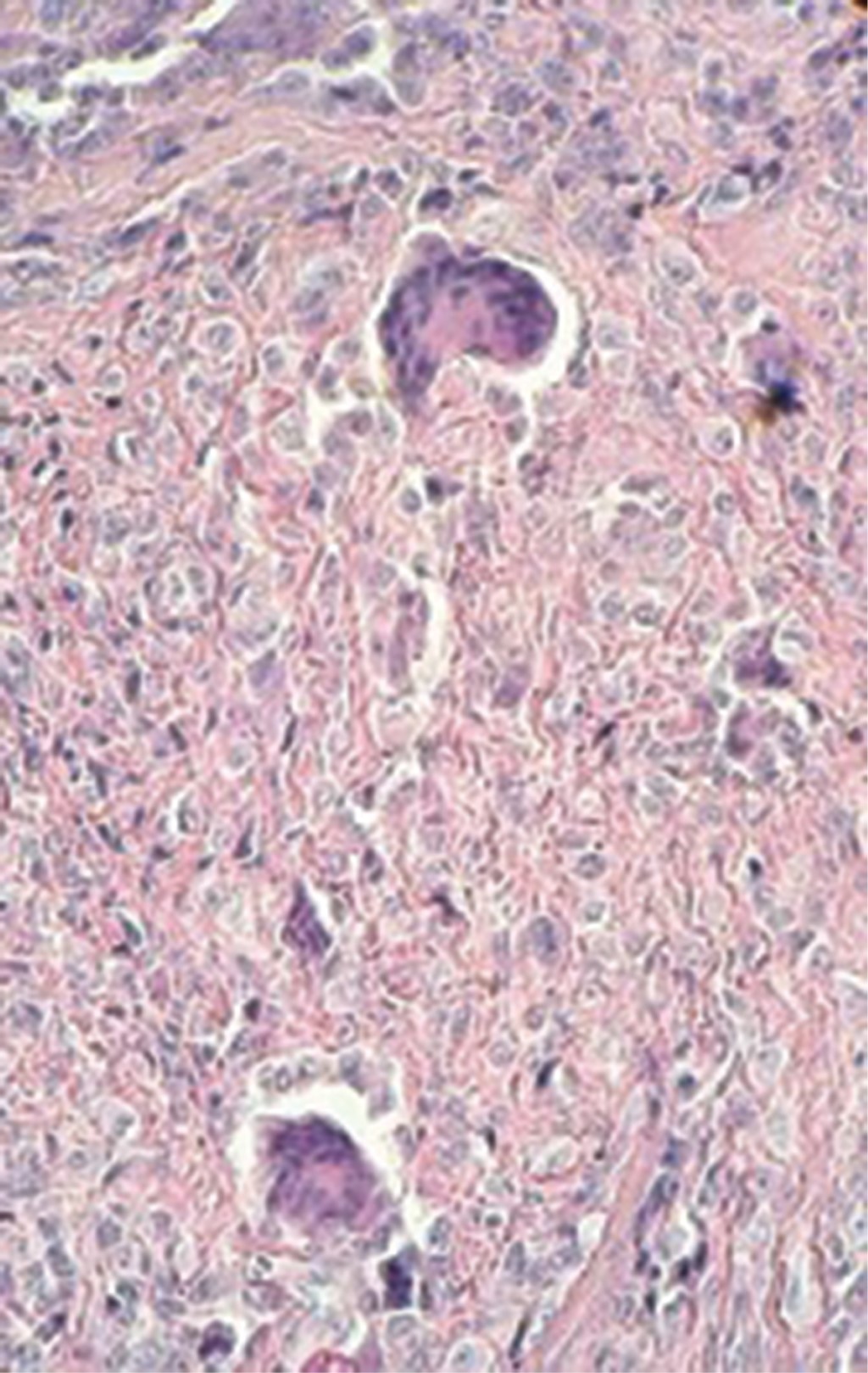 En la histopatología del TCGVT se observan lóbulos con celularidad mixta rodeados de colágena densa. Las células del infiltrado muestran un núcleo vesiculoso con contenido lipídico, o con hemosiderina, lo cual proporciona aspecto espumoso a estas células. Además, se observan células gigantes eosinofílicas y multinucleadas, similares a los osteoclastos. Estas células contienen hasta 60 núcleos, y se forman por fusión de células mononucleares.16