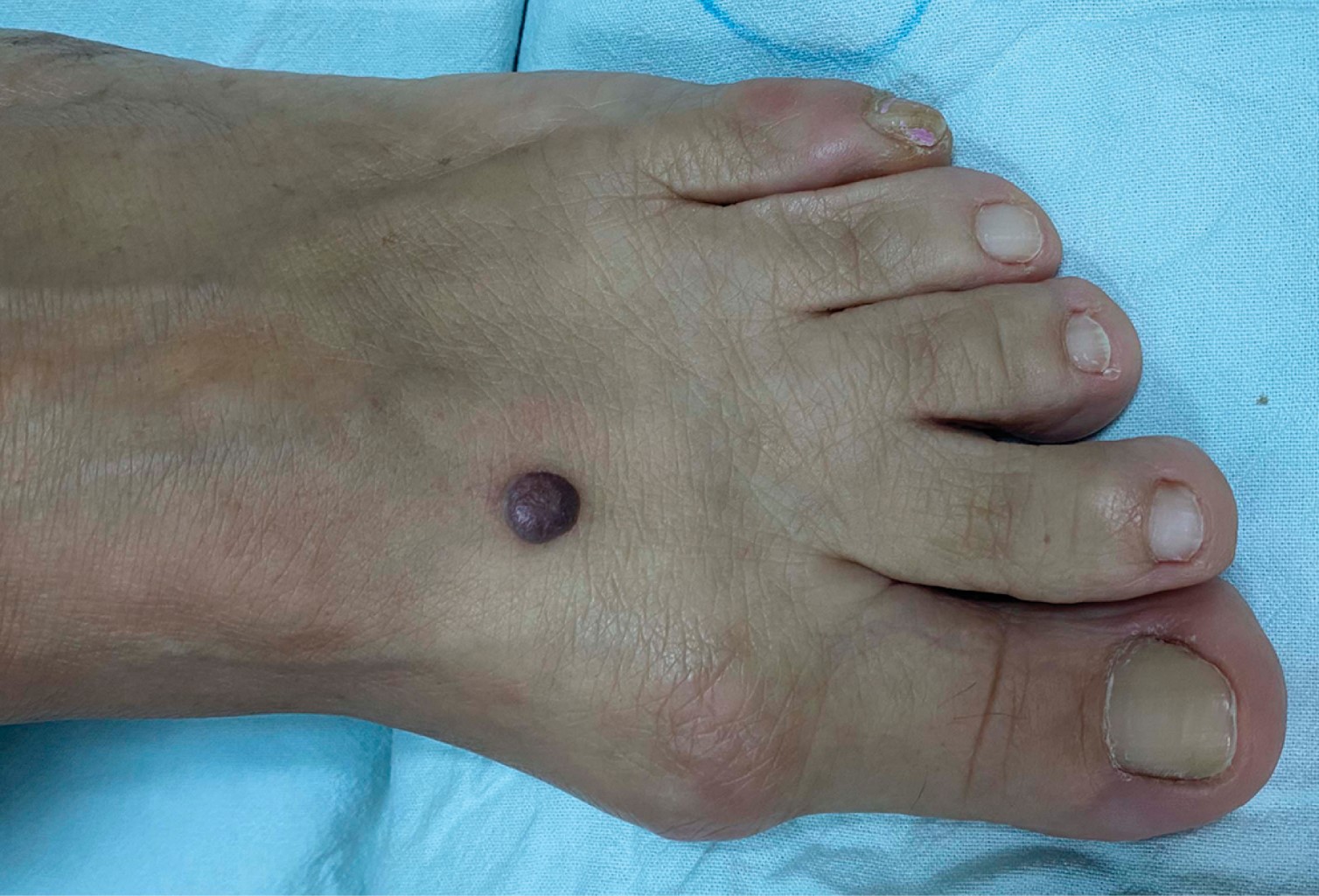 Paciente del sexo femenino, de 68 años, quien acude a valoración por presentar una neoformación en dorso de pie izquierdo, a nivel de tarso, de tres años de evolución. Cuenta con el antecedente de rasurado previo de la misma lesión en el año 2013, cuyo diagnóstico histopatológico fue de poroma ecrino. Sin otros antecedentes personales relevantes para el padecimiento actual.