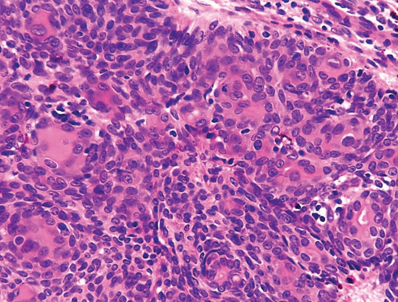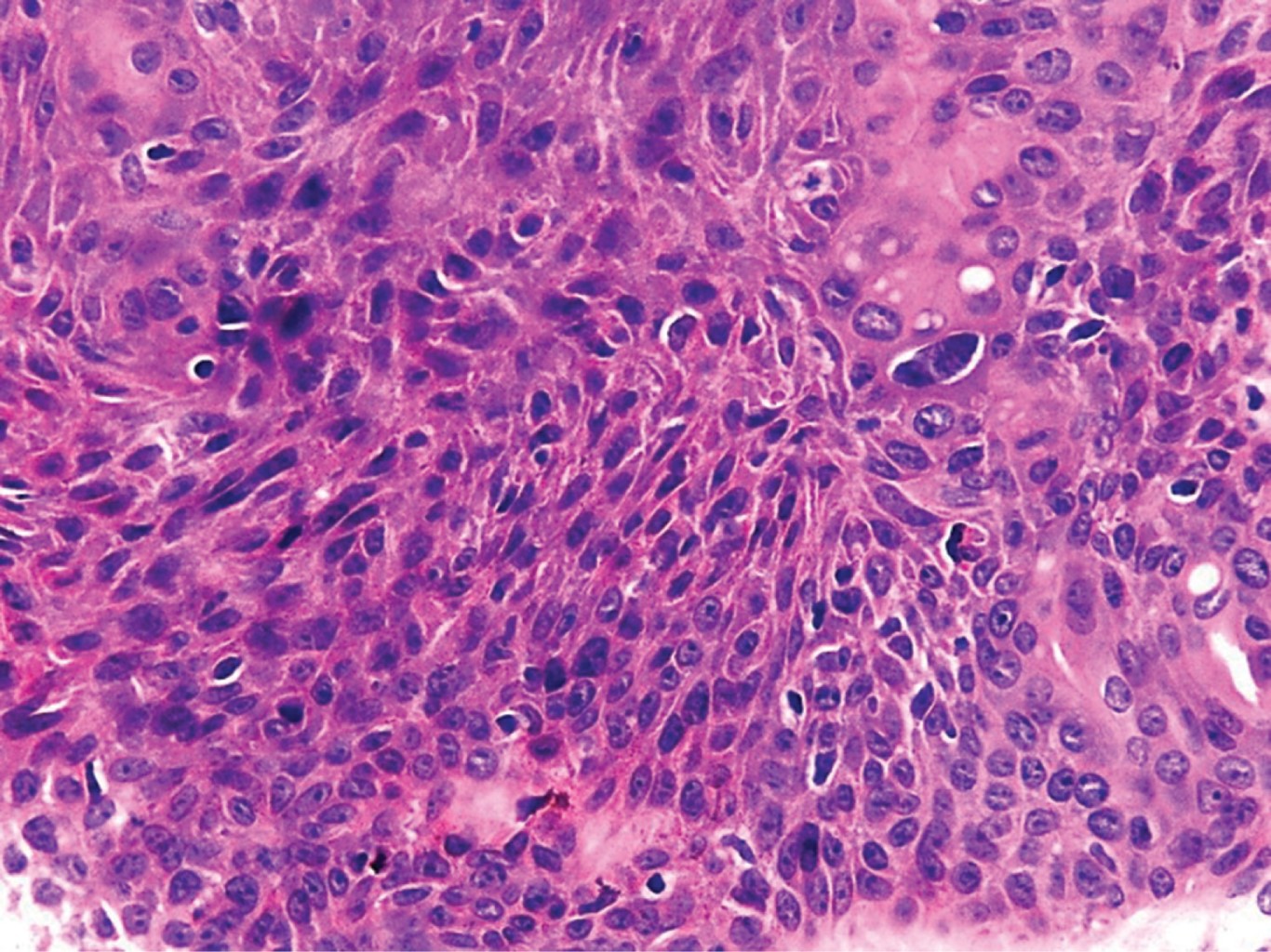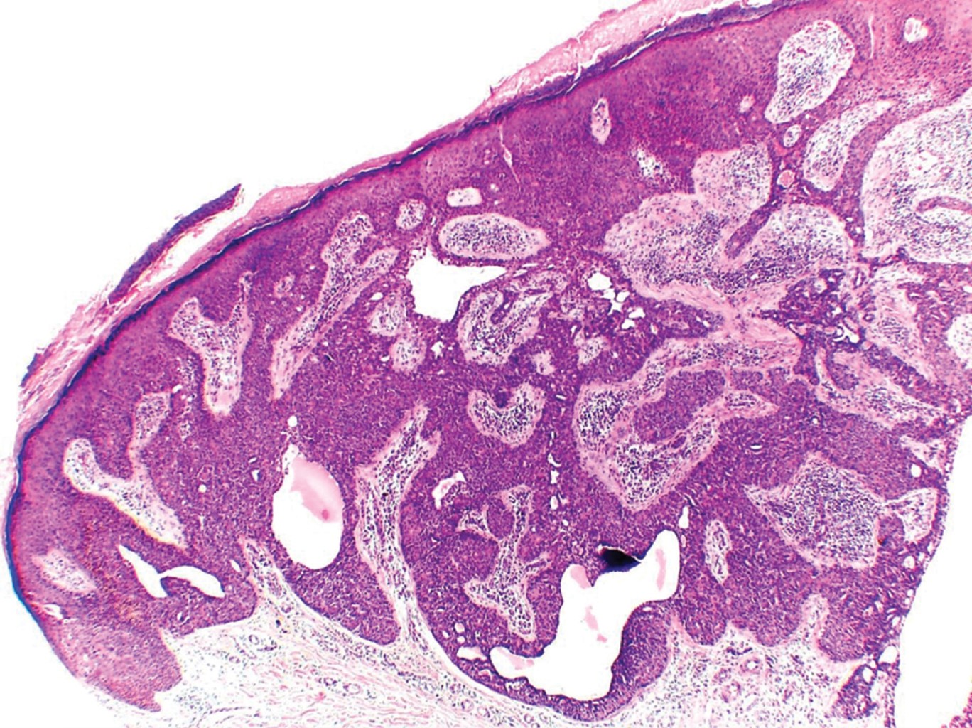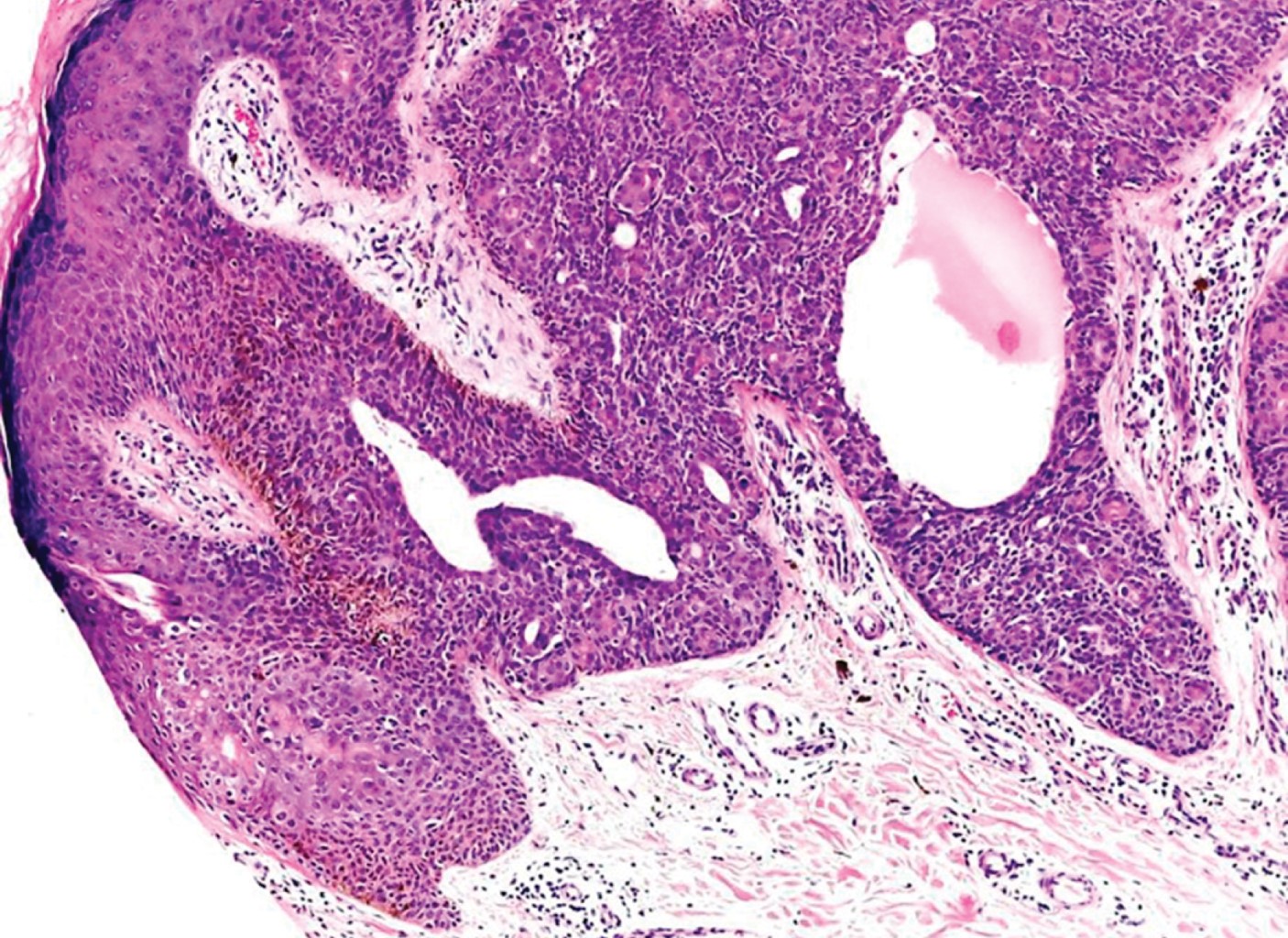 Con la sospecha clínica de probable poroma ecrino se realiza biopsia excisional. El estudio histopatológico reporta neoformación Exofítica, cuya epidermis muestra hiperqueratosis paraqueratósica (Figura 3). En todo el espesor de la dermis se observan cordones tumorales conectados con la epidermis, los cuales se anastomosan atrapando papilas (Figura 4); están constituidos por células de núcleos basofílicos, algunas de las cuales presentan núcleos grandes e hipercromáticos, mitosis anormales y metaplasia escamosa; presentan estructuras ductales y pigmento melánico, rodeados por una moderada reacción inflamatoria (Figuras 5 y 6). El diagnóstico histopatológico fue de porocarcinoma ecrino. En el Servicio de Dermatooncología de esta Unidad se efectúa extirpación quirúrgica más amplia, con margen de 7 cm, con reparación del defecto llevando a cabo un injerto, sin evidenciar lesión tumoral remanente en la histopatología. Al considerarse un tumor con alto potencial metastásico, se envía al paciente a hospital de tercer nivel para hacer estudios de extensión y seguimiento.