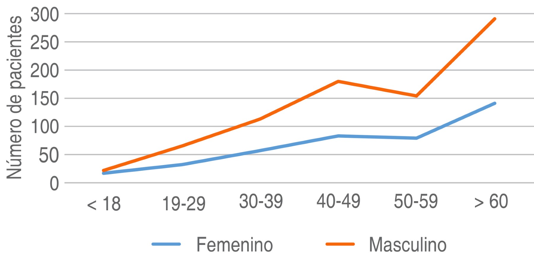 Como se puede apreciar en la Figura 1, predominan pacientes del género masculino con 416 casos (50.4%), seguido del femenino con 409 (49.6%), p = 0.77 (IC 95%). En la distribución por grupos de edad, como se puede observar en la Figura 1, la mayor parte de la población estudiada se encontró en el grupo de pacientes mayores a 60 años, que comprende 35.3% (n = 291) de los pacientes analizados, seguido por el grupo de edad de 40-49 años con 21.8% (n = 180).