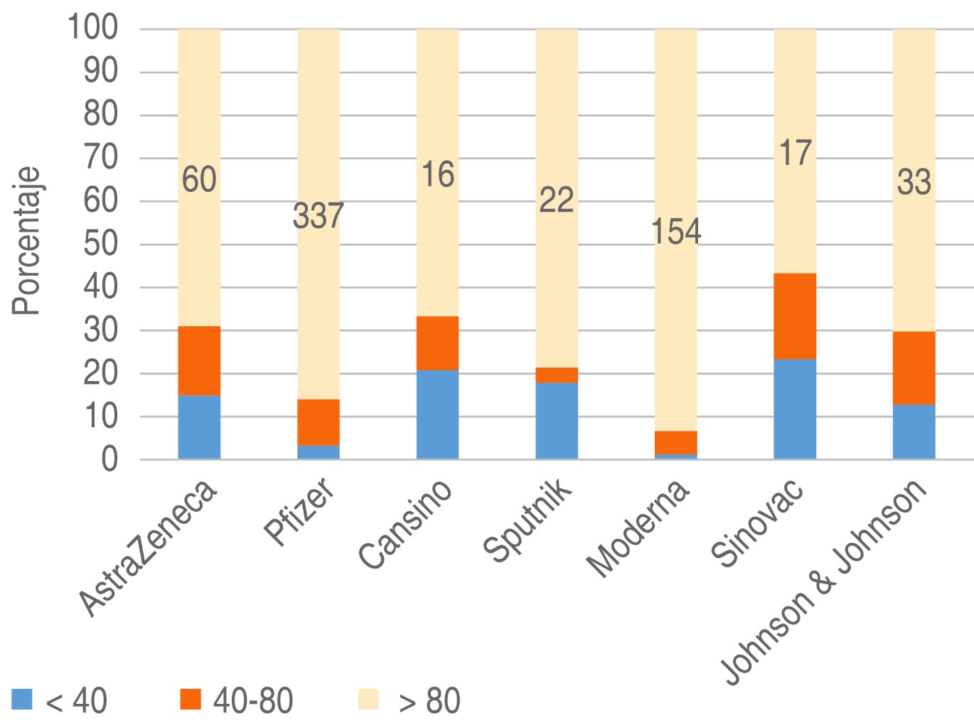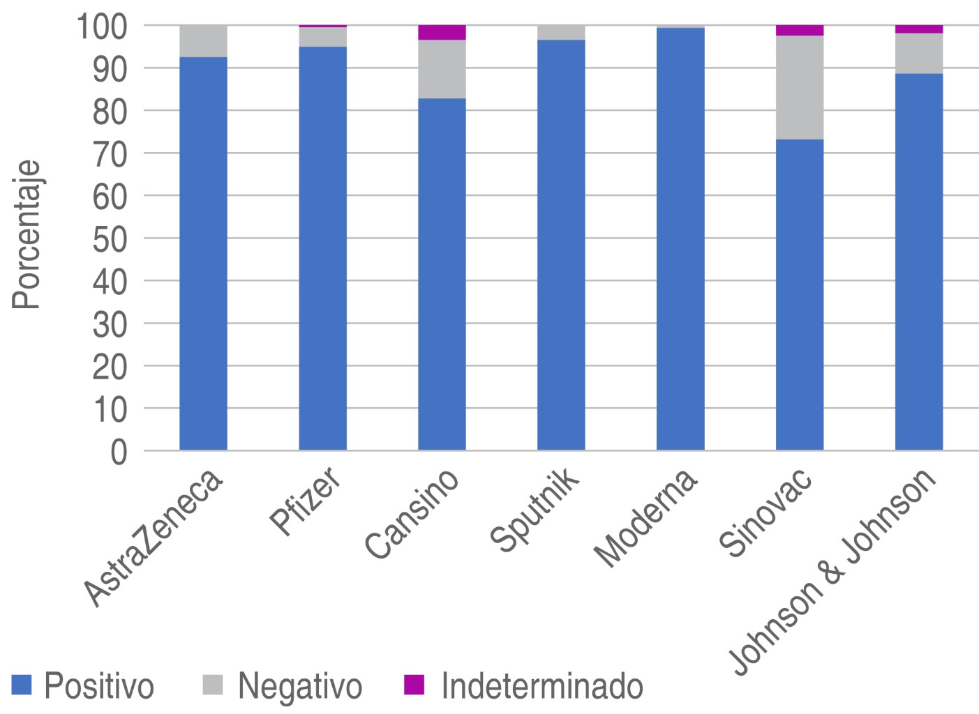 El total de pacientes analizados que contaban con información completa fue de 825, se descartaron 316 por no contar con los criterios de inclusión al estudio. El tipo de vacuna que refirieron los pacientes al momento de realizar el estudio de monitoreo de niveles de anticuerpos IgG contra proteína espiga del SARS-CoV-2 fueron los siguientes: Pfizer (n = 413, 50.1%), Moderna (n = 166, 20.1%), AstraZeneca (n = 94, 11.4%), Johnson & Johnson (n = 53, 6.4%), Sinovac (n = 41, 5%), Sputnik (n = 29, 3.5%) y Cansino (n = 29, 3.5%). Como se puede observar, predominan las vacunas con tecnología de ARNm (Pfizer más Moderna) con 579 pacientes (70.2%). Le siguen la tecnología de vector viral replicante (AstraZeneca, Johnson & Johnson, Sputnik, Cansino) con un total de 205 pacientes (24.8%) y la vacuna de virus inactivados con 41 (5%).