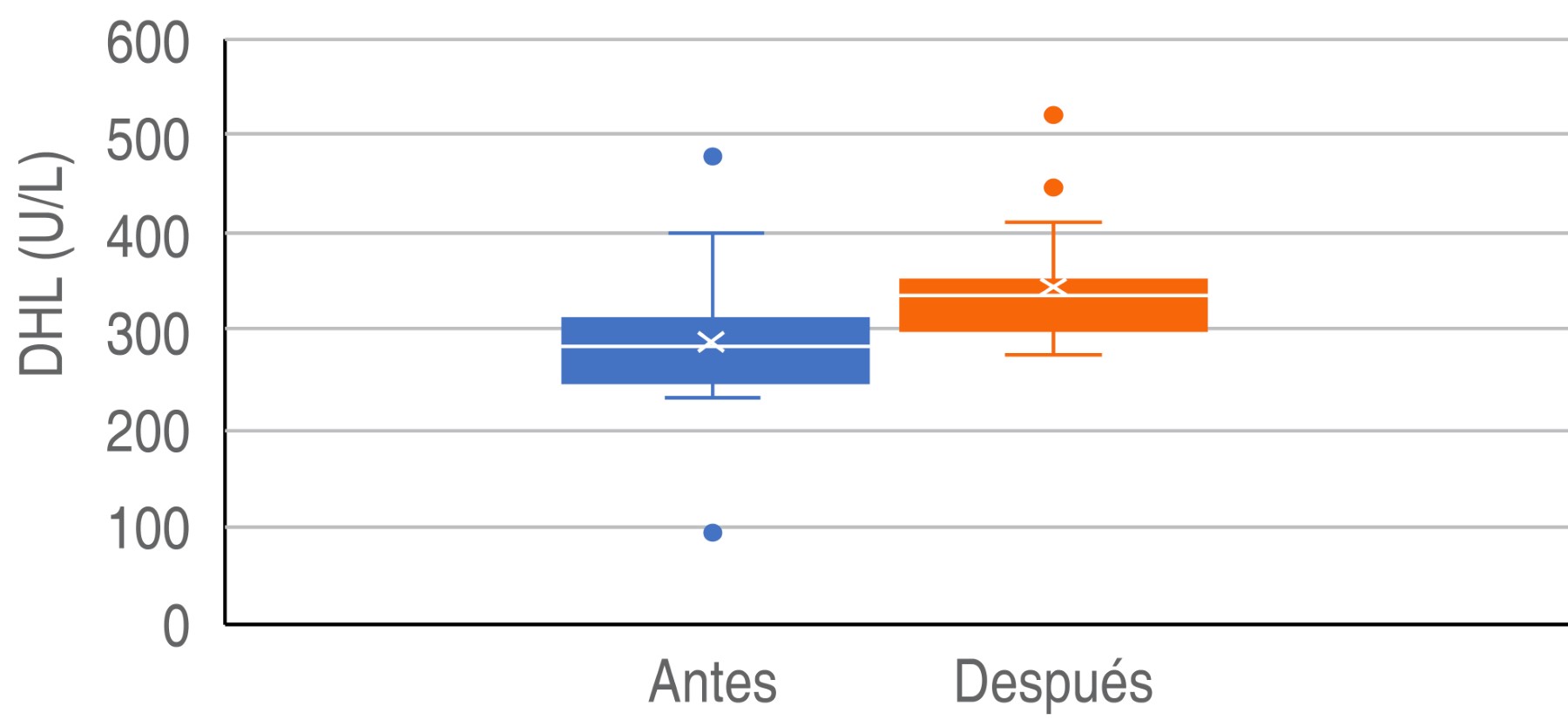 La Tabla 4 muestra los biomarcadores asociados a la actividad muscular antes y después de la práctica deportiva. Se encontraron aumentos significativos en la deshidrogenasa láctica (DHL), albúmina, cistatina C, creatincinasa (CK) y ácido láctico sérico, datos esperados después de la actividad física. Las Figuras 1 y 2 muestran los cambios en CK y DHL, variables que usualmente se elevan con la práctica de ejercicio, los niveles basales de ambas se encontraron en los valores de referencia.