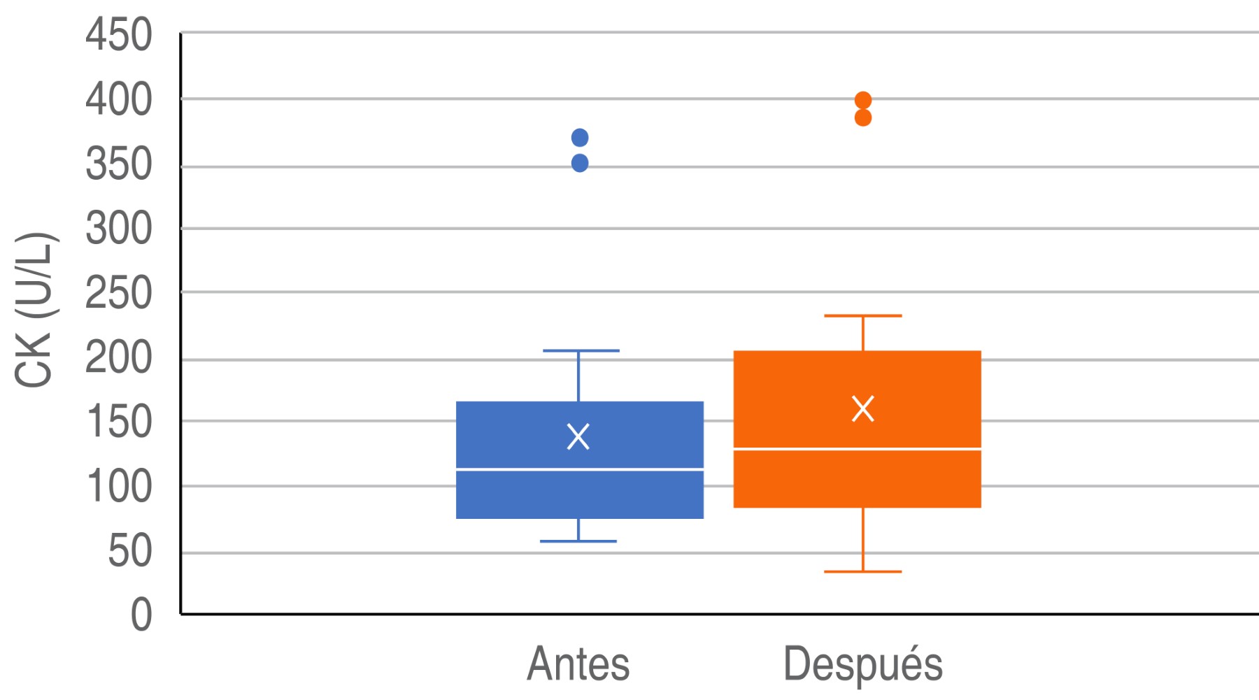 En los valores de CK, una de las participantes presentó, tanto en reposo como en respuesta al ejercicio, valores excesivamente altos, por lo que fue excluida del estudio en forma específica, mediante el análisis estadístico de examen de aberrantes. A esta participante, en su beneficio, se le dio seguimiento independiente y se le envío al médico para descartar alguna patología.