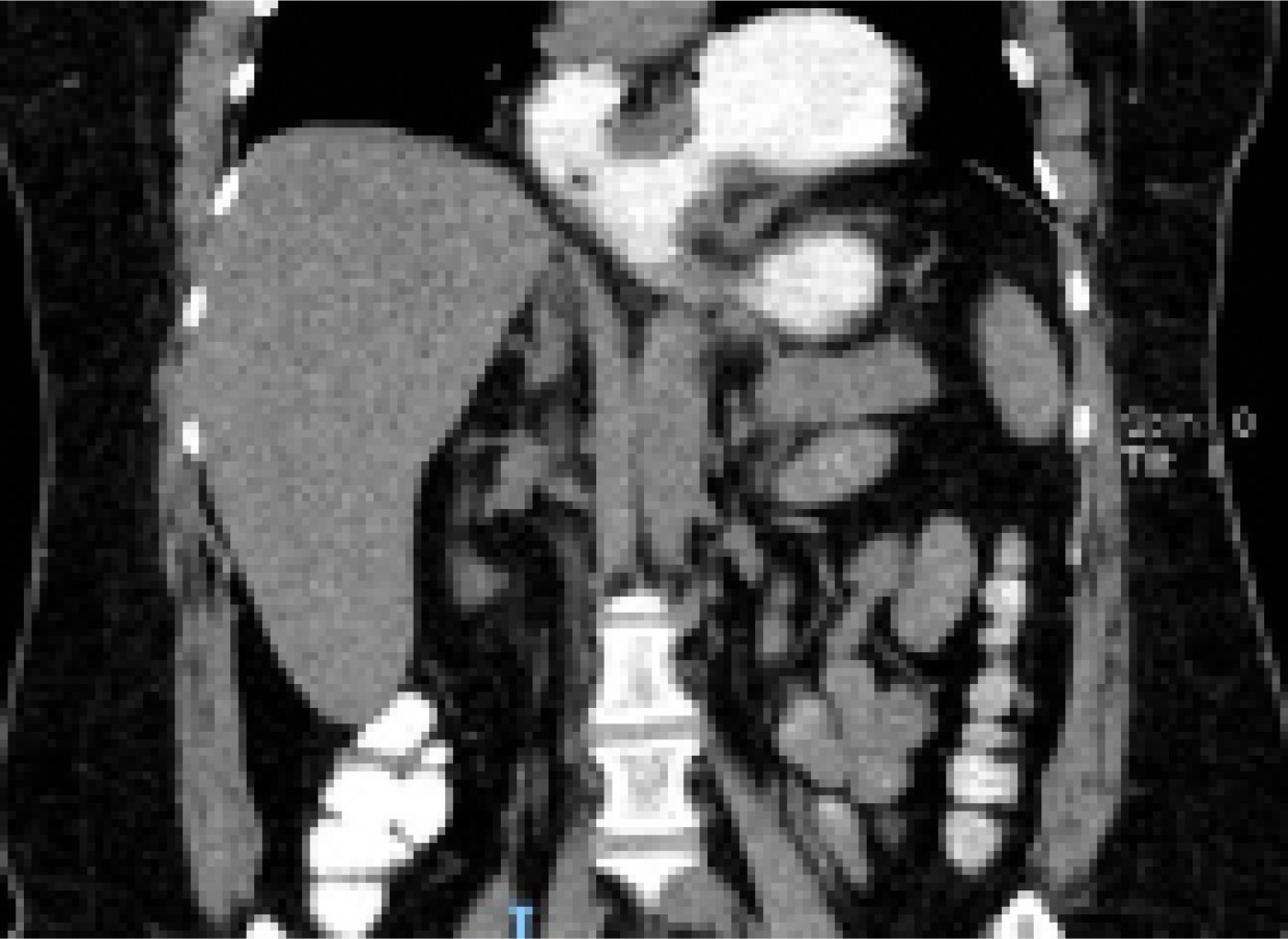 Paciente femenino de 49 años con antecedentes de apendicectomía, cesárea e histerectomía y cuadro clínico de un mes de evolución con dolor abdominal epigástrico que irradiaba a tórax y en hemicinturón derecho, así como náusea. Acudió al servicio de urgencias por dolor de inicio súbito en región epigástrica con 9/10 en escala del dolor, acompañado de náusea y vómito. Tensión arterial 117/75 mmHg, frecuencia cardiaca 75 lpm, frecuencia respiratoria 21 rpm, saturación O2 93% e índice de masa corporal de 31.5 kg/m2. A la exploración física se encontró con facies álgica, posición antiálgica en decúbito lateral izquierdo, el abdomen blando, depresible, con dolor a la palpación media en epigastrio y marco cólico derecho, timpanismo aumentado a la percusión, con peristalsis presente y signo de Blumberg negativo.