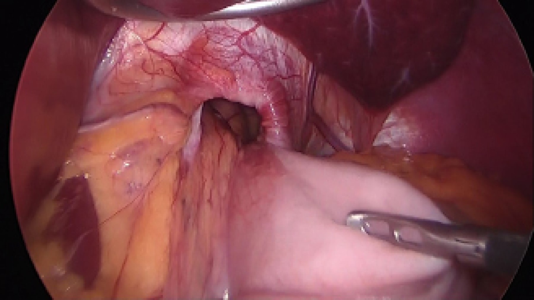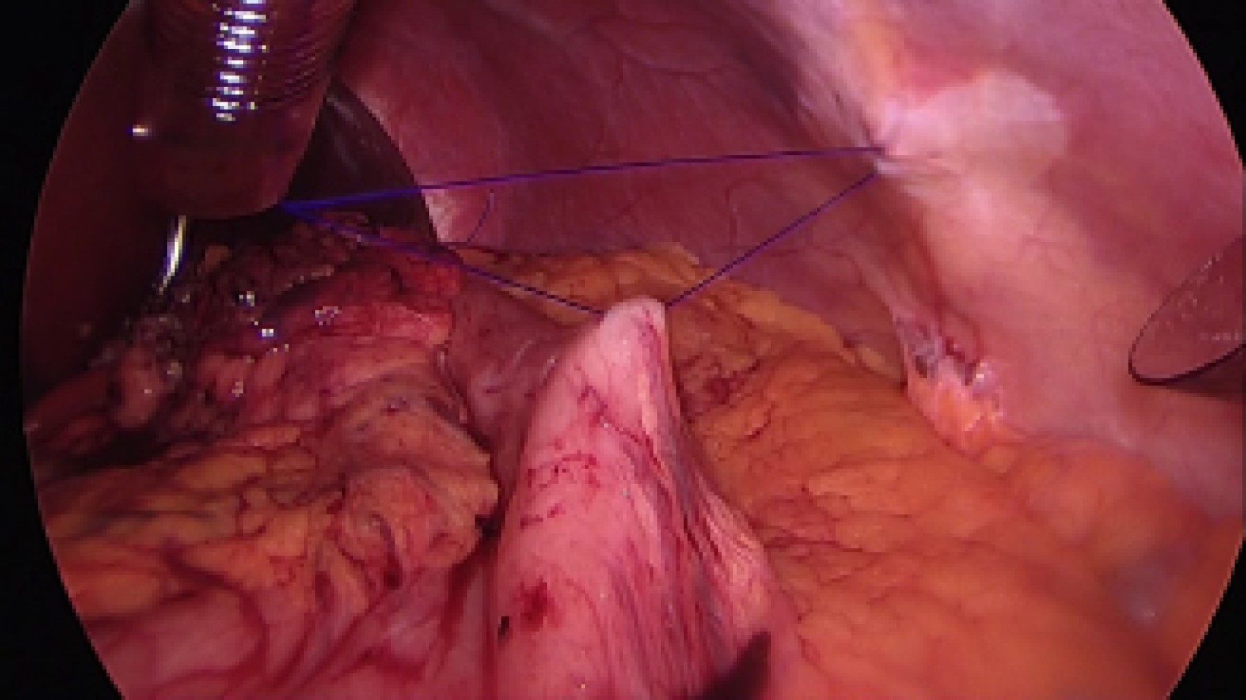 Técnica quirúrgica: bajo anestesia general se efectuó laparoscopía diagnóstica con colocación de cuatro puertos, separador de Nathanson, se encontró cuerpo de estómago por arriba del hiato, se procedió a la reducción del estómago del fondo gástrico y desvolvulación, se cerraron los pilares diafragmáticos con sutura prolene 2-0 llevando a cabo funduplicatura parcial tipo Toupet con calibración por endoscopía transoperatoria de 60 French con dos puntos para fijación del labio derecho de la funduplicatura y un punto del labio izquierdo hacia los pilares, se corroboró la confección de la funduplicatura con endoscopía, además de gastropexia a la pared abdominal anterior con sutura prolene 2-0. No hubo complicaciones (Figuras 3 y 4) y se finalizó evento quirúrgico. El posoperatorio inmediato fue en cuidados intermedios para vigilancia por riesgo de complicaciones.