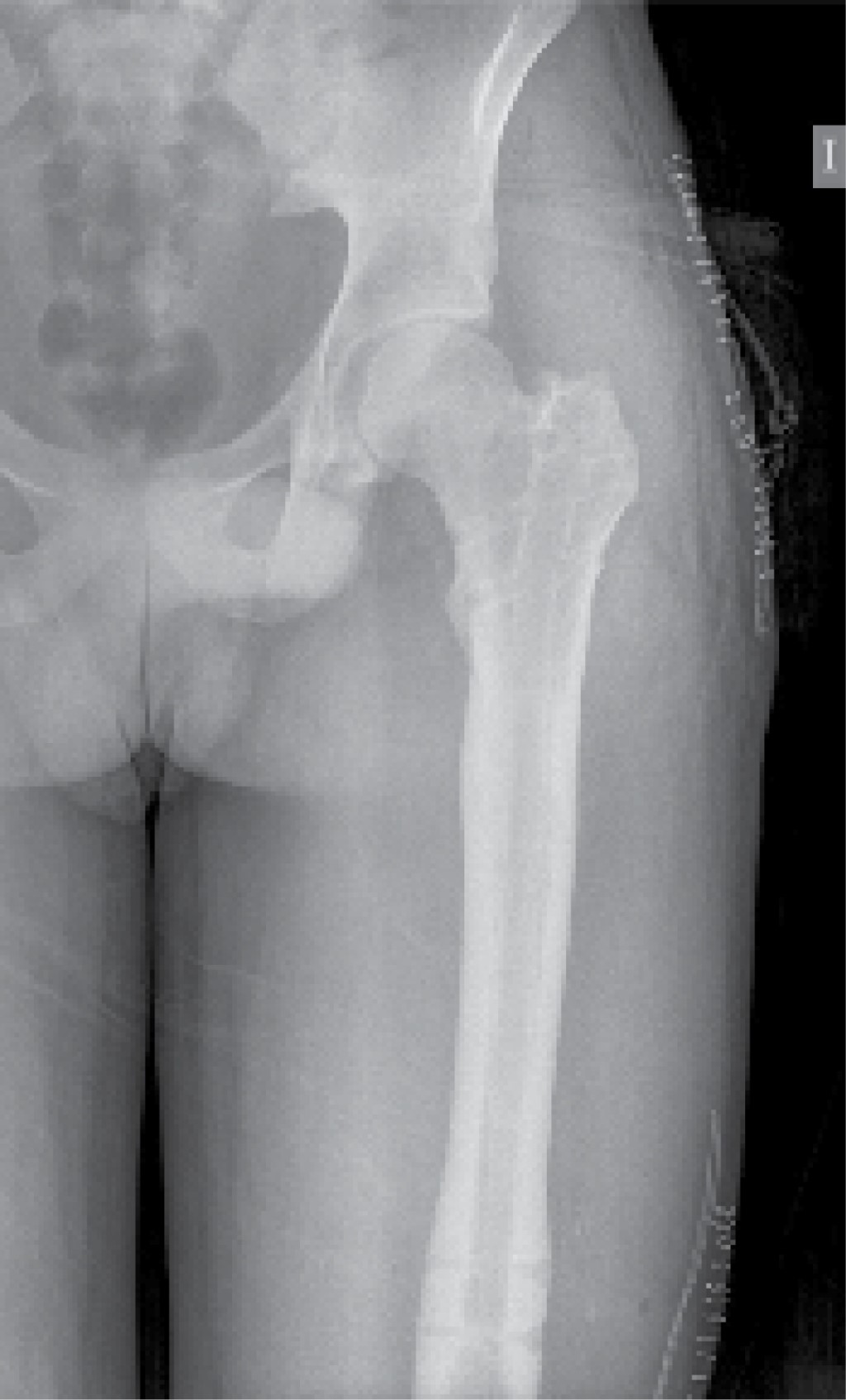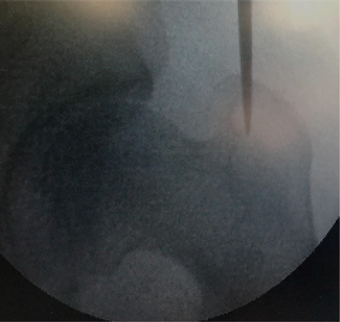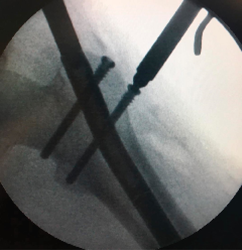 La intervención quirúrgica se realizó con el paciente en decúbito supino sobre una mesa de material radiolúcido y bajo control radiográfico intraoperatorio. La longitud y el diámetro del clavo se determinó preoperatoriamente según las radiografías previas y teniendo en cuenta el peso del paciente, que condiciona el diámetro del clavo como describen Green y colaboradores.8 De esta manera, para pacientes con un peso corporal menor o igual a 114 kg se debe emplear un clavo de 10.7 o 12.5 mm de diámetro; mientras que para pesos corporales menores de 57 kg se utiliza el clavo de 8.5 mm de diámetro.