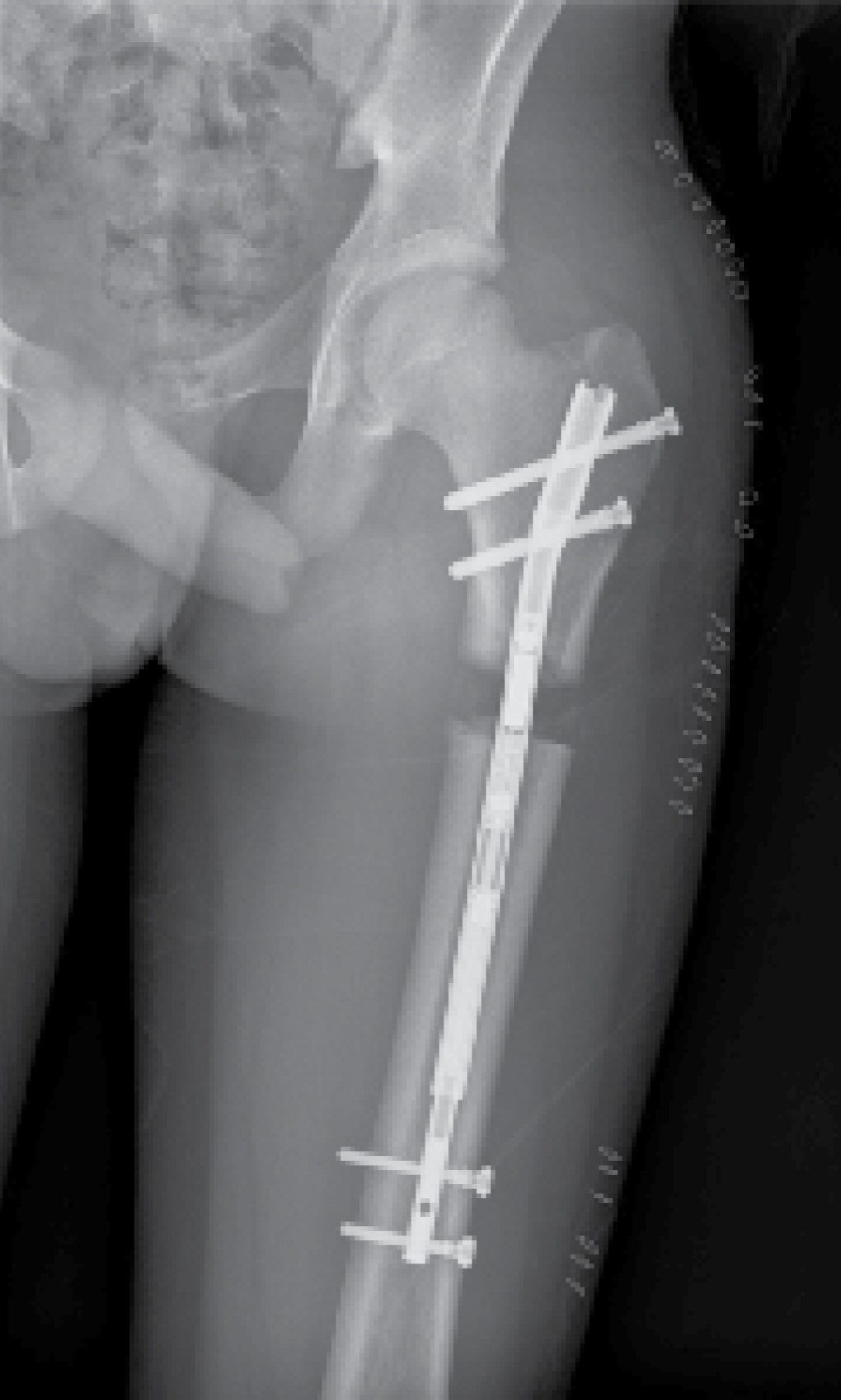 Se identificó el lugar de la osteotomía femoral siguiendo el método habitual descrito por Paley y colaboradores,13 realizándose mediante múltiples perforaciones a través de un abordaje lateral. Como describen algunos autores, estas perforaciones registran una baja tasa de tromboembolismo pulmonar.2 El punto de entrada del clavo se realizó en la punta del trocánter mayor a través de un abordaje lateral proximal (Figura 1), que permitió el fresado del canal femoral hasta 1.5-2 mm mayor que el diámetro definitivo del clavo seleccionado. Se introdujo el clavo intramedular Precice® hasta el borde proximal de la zona de osteotomía y se completó la misma a través del abordaje lateral, introduciendo el clavo hasta su localización definitiva y bloqueándolo proximal y distalmente (Figura 2). Por último, se realizó la distracción del clavo 1-2 mm para asegurar el correcto funcionamiento del dispositivo magnético.
