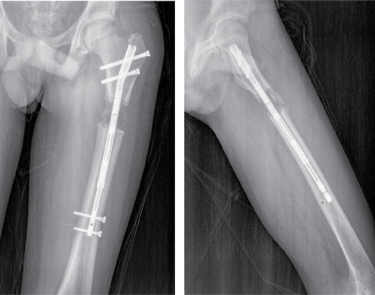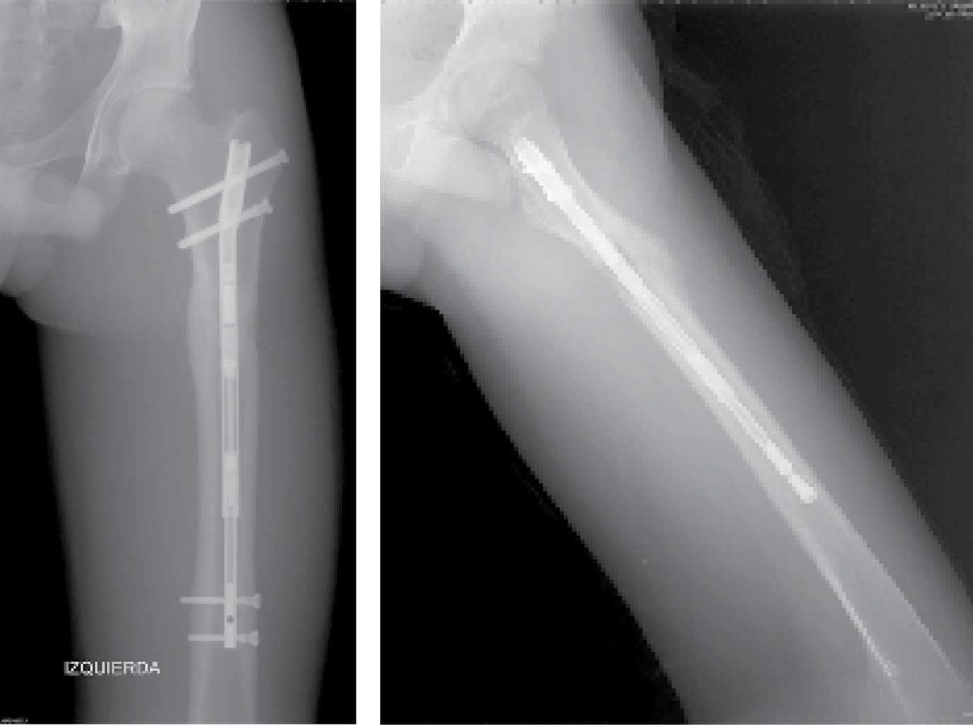 Cabe destacar que se ha realizado la retirada del clavo tras un período de 12 meses de seguimiento en dos pacientes. Solamente en un estudio de Farsetti y colaboradores con 20 casos consecutivos de alargamiento femoral se extrajeron todos los clavos a los ocho meses después de visualizarse la consolidación radiológica.21
