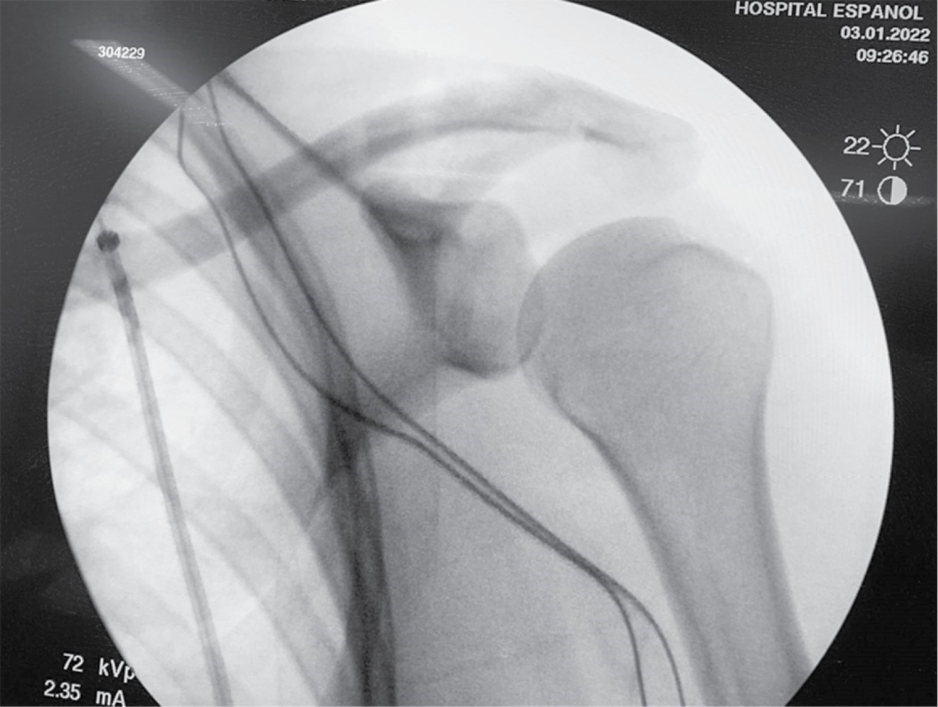 El injerto además de servir para la reconstrucción de los ligamentos CC, su interposición en el espacio AC funciona como espaciador, reemplazando la función del disco articular de dicha articulación. Se toma un control fluoroscópico en proyección anteroposterior, corroborando adecuada reducción de articulación AC (Figura 10). Se procede a irrigar herida quirúrgica con Microdacyn. Se cierra cuidadosamente la fascia deltotrapezoidea con puntos interrumpidos con sutura absorbible (Vicryl 2.0) y posteriormente por planos: tejido celular subcutáneo con sutura Vicryl 2.0 con puntos invertidos en "U" y piel con sutura Stratafix 3-0 con puntos continuos subdérmicos. Se inmoviliza extremidad torácica con inmovilizador de hombro y banda aductora.
