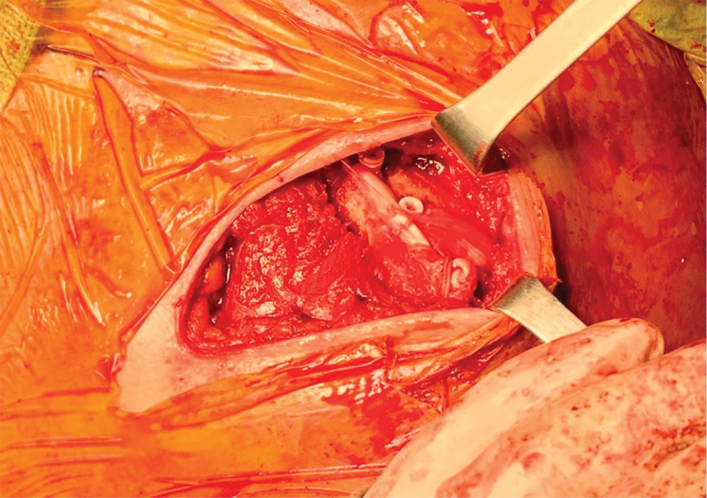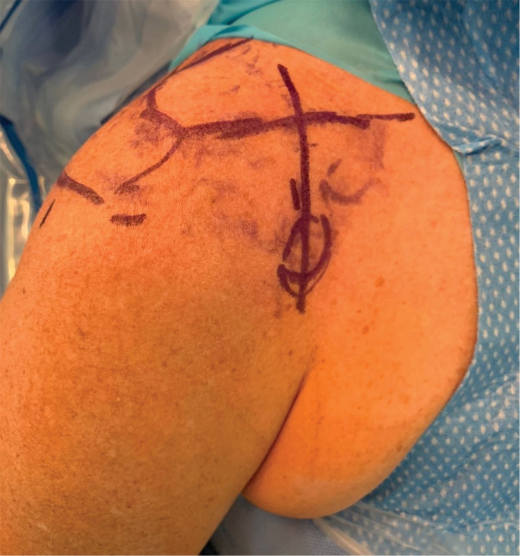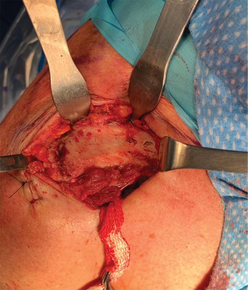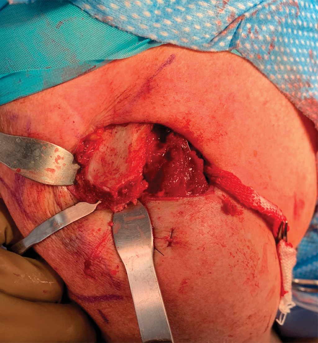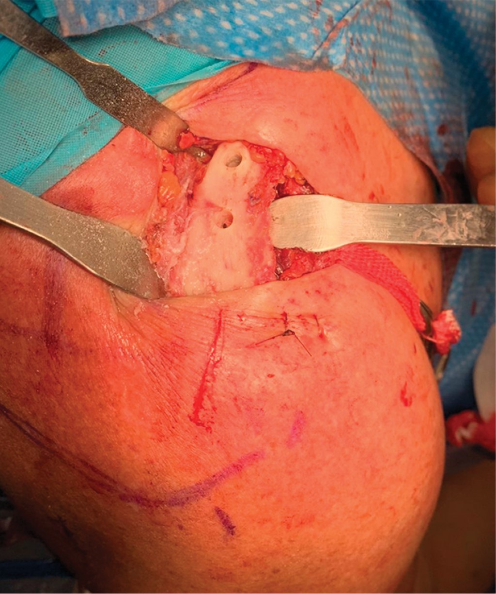 Con el paciente bajo anestesia general balanceada y previa profilaxis antibiótica, se le coloca en posición de silla de playa a 60o de flexión. Por anatomía de superficie se identifican referencias anatómicas: apófisis coracoides, acromion y la articulación AC (Figura 2). Se realiza una incisión en el borde anterior de la clavícula de 5 cm lateral a la articulación AC y se extiende hacia la apófisis coracoides siguiendo las líneas de Langer. Se diseca por planos realizando hemostasia con electrocauterio hasta identificar el músculo deltoides en la parte anterior de la clavícula y la inserción del trapecio en su cara posterior; se realiza disección roma del fascículo deltoideo en dirección a la apófisis coracoides hasta localizar la base de ésta y se pasa una gasa estéril como referencia. Se realiza exposición completa de clavícula y de articulación AC así como de sus tejidos blandos que impiden la reducción articular (Figura 3). Se resecan 3 mm del borde distal de la clavícula y se retiran tejidos blandos (remanente de ligamentos AC y disco articular) (Figura 4).