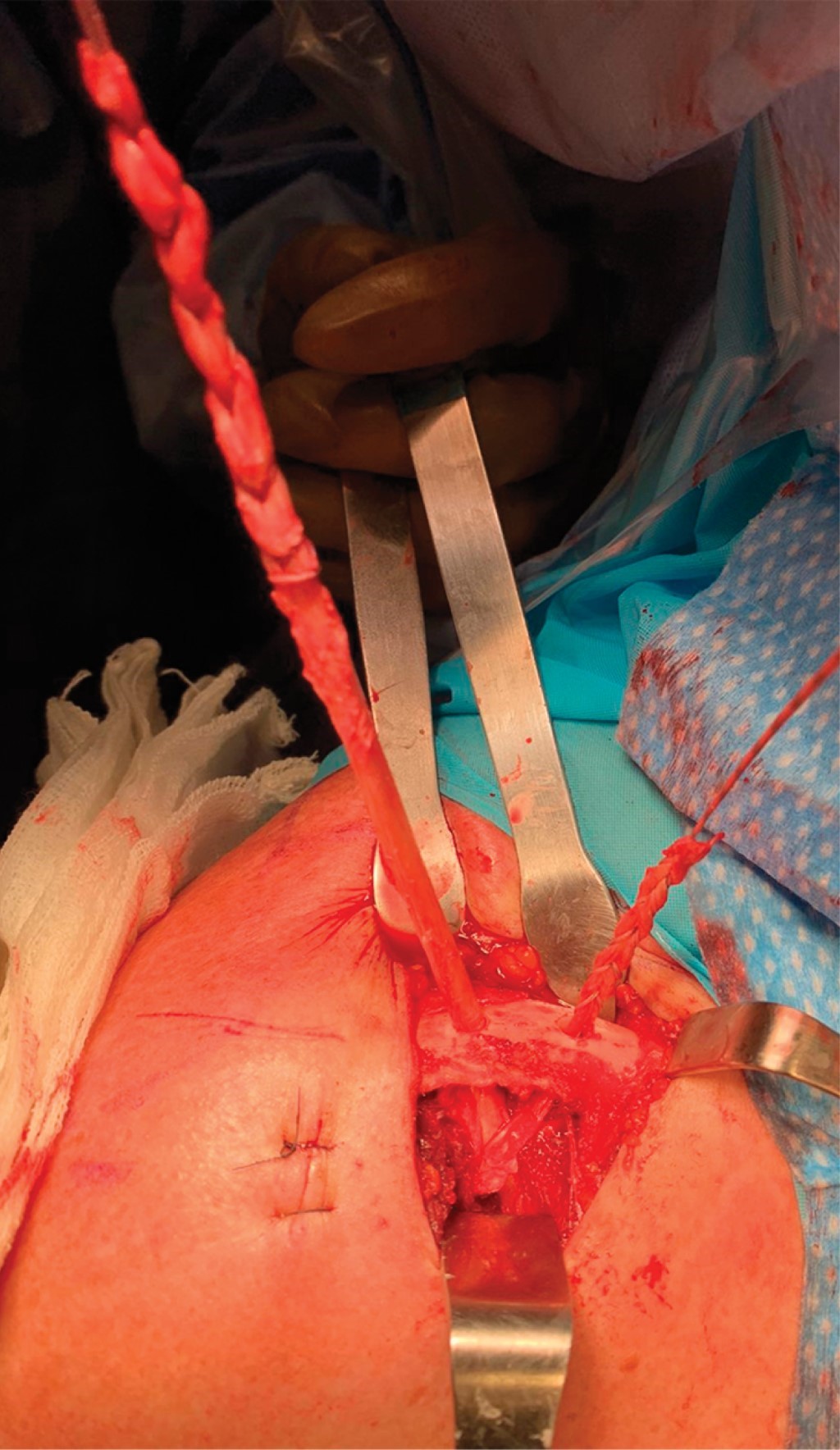 El injerto se pasa por debajo de la apófisis coracoides de medial a lateral bajo visión directa con ayuda de una guía de nitinol o de una gasa y se le da una configuración de "8" para pasar a través de ambos túneles en la clavícula (Figura 6).