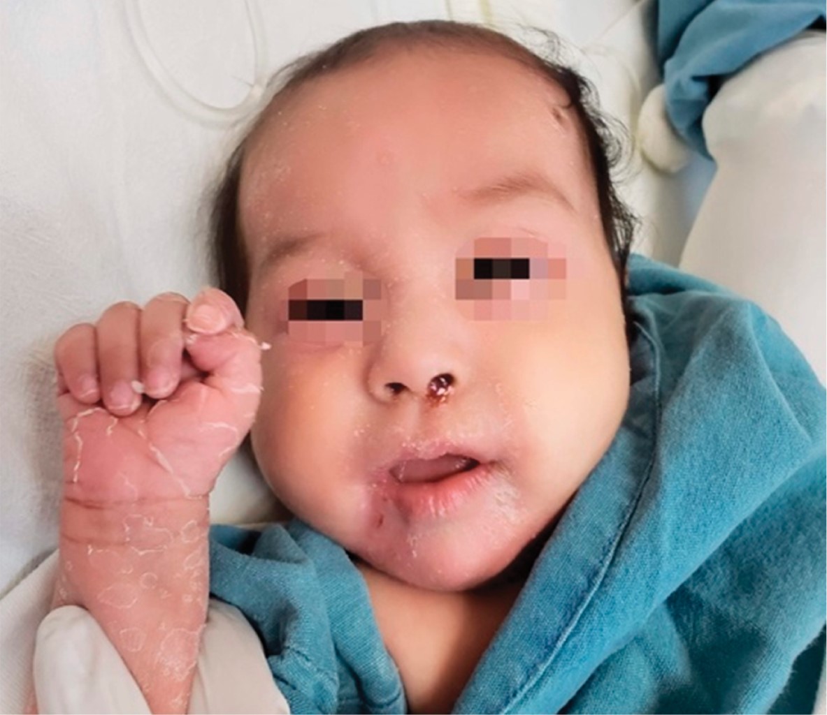 A la exploración física se recibe con frecuencia cardiaca (FC) 135 lpm, frecuencia respiratoria (FR) 61 rpm, tensión arterial (TA) 65/49 mmHg, temperatura (T) 36.8 oC y saturación arterial de oxígeno (SatO2) 95% y los datos clínicos positivos: hipotonía, palidez de tegumentos, descamación gruesa generalizada de predominio en cara y extremidades (Figuras 1 y 2), mucosas en regular estado de hidratación, abundante rinorrea sanguinolenta (Figura 3), cardiopulmonar sin compromiso, abdomen globoso, peristalsis de adecuada intensidad y frecuencia, hepatomegalia 7 x 5 x 5 cm, bazo no palpable.