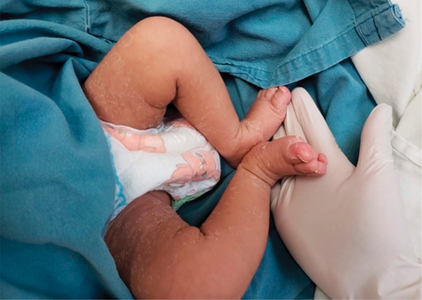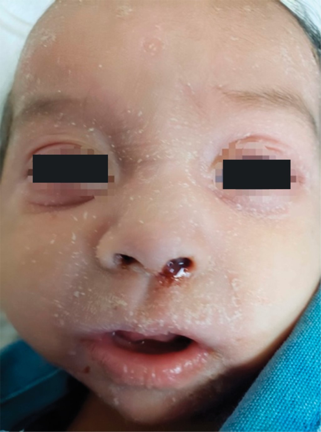 Femenino de un mes de vida, producto de la gesta uno de madre de 17 años, sin control prenatal. Obtenida vía vaginal de 38.5 semanas de gestación por Capurro, Apgar 8-9 y Silverman-Anderson de 0, se reportó peso al nacimiento de 2,150 gramos, talla 48 cm, perímetro cefálico de 35 cm. Posterior al nacimiento aparentemente no tuvo ninguna eventualidad. A la tercera semana de vida presenta rinorrea abundante en ocasiones sanguinolenta y congestión nasal importante que le condicionan dificultad para alimentarse. Niega fiebre, tos o sintomatología agregada. Posteriormente presenta una dermatosis generalizada, por lo que la madre decide acudir a revisión.