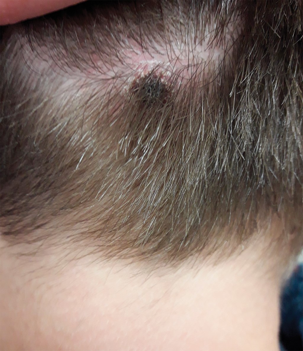 Paciente varón de seis años, de origen español, sin antecedentes de interés ni viajes previos, que acude a consulta con fiebre, adenopatías cérvico-occipitales bilaterales y dos lesiones cutáneas: una en el cuero cabelludo (Figura 1) y otra en el tronco con días de evolución. En la exploración se observa una lesión costrosa en el cuero cabelludo occipitoparietal, de 2 × 2 cm, y otra a nivel torácico izquierdo. De la misma manera, se observan dos adenopatías cervicales bilaterales, la mayor de ellas de aproximadamente 2 cm de diámetro, bien definidas, elásticas, no adheridas y ligeramente dolorosas a la palpación, sin otros hallazgos de interés. Los padres refieren que la picadura de la garrapata ocurrió el día anterior, mientras jugaba con algunos perros.