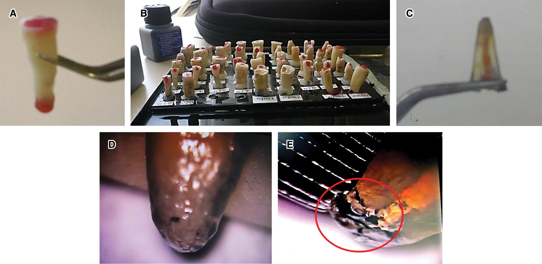 En relación con los controles, se evidenció que en el control negativo no hubo penetración de tinte (0.00), mientras que los controles positivos mostraron tinta con una máxima penetración de 3.00 mm (Figura 1D y E, Tabla 2).