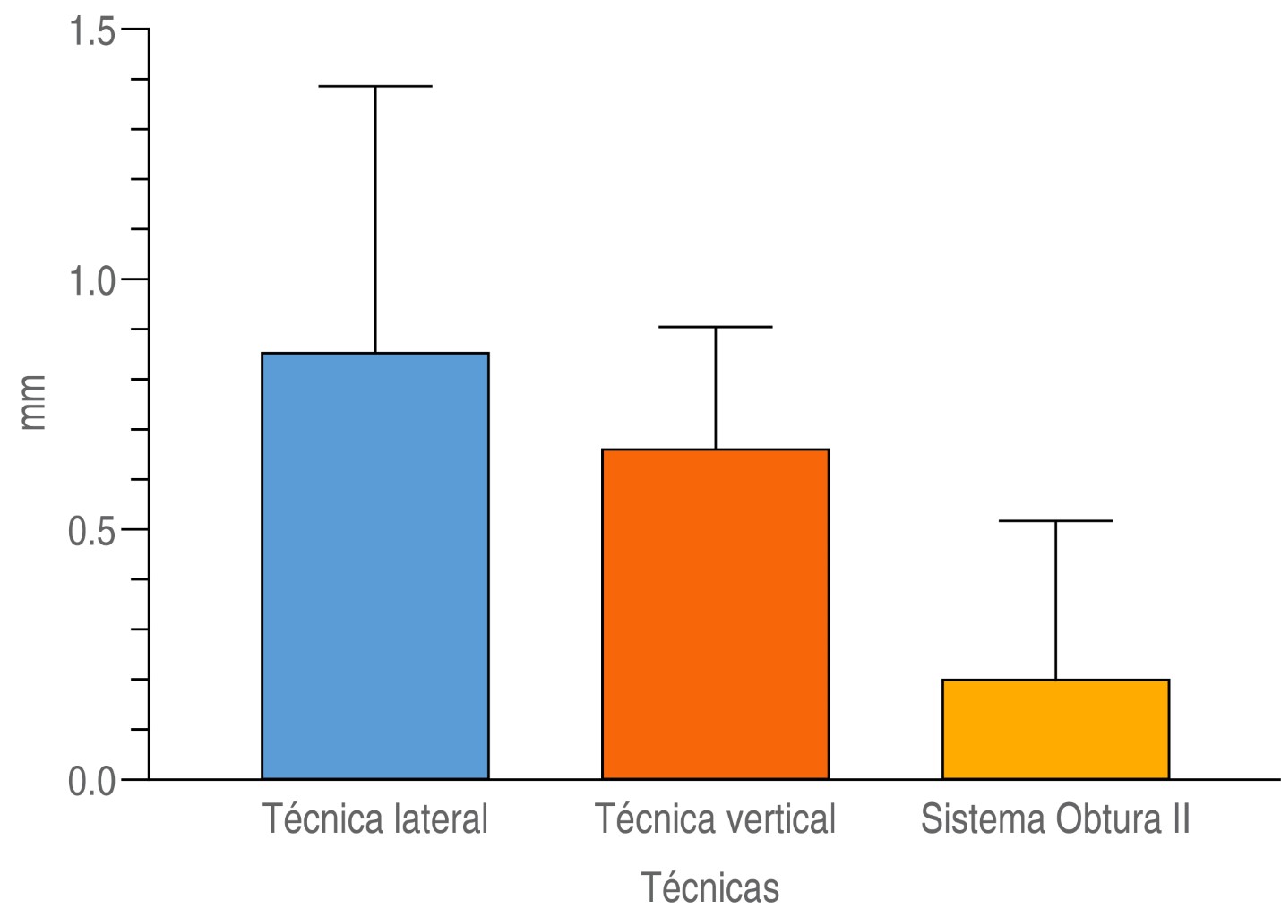 Por otra parte, se realizó un gráfico para obtener una visión general del comportamiento de las muestras (Figura 2). El eje vertical muestra la microfiltración (en mm), mientras que el eje horizontal indica las técnicas de obturación utilizadas. Se puede observar que los grupos se comportaron de manera diferente, y se evidencia que hubo una filtración importante en el grupo que fue obturado con la técnica lateral y una mínima filtración en el grupo Obtura II.