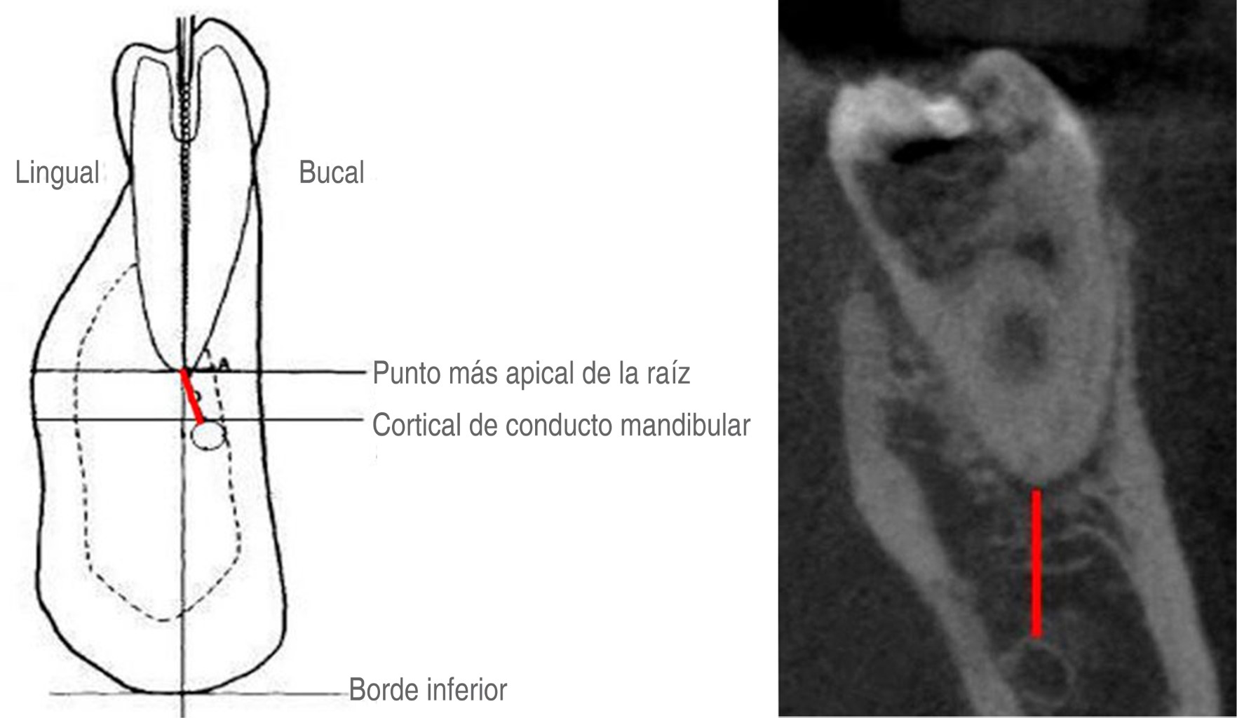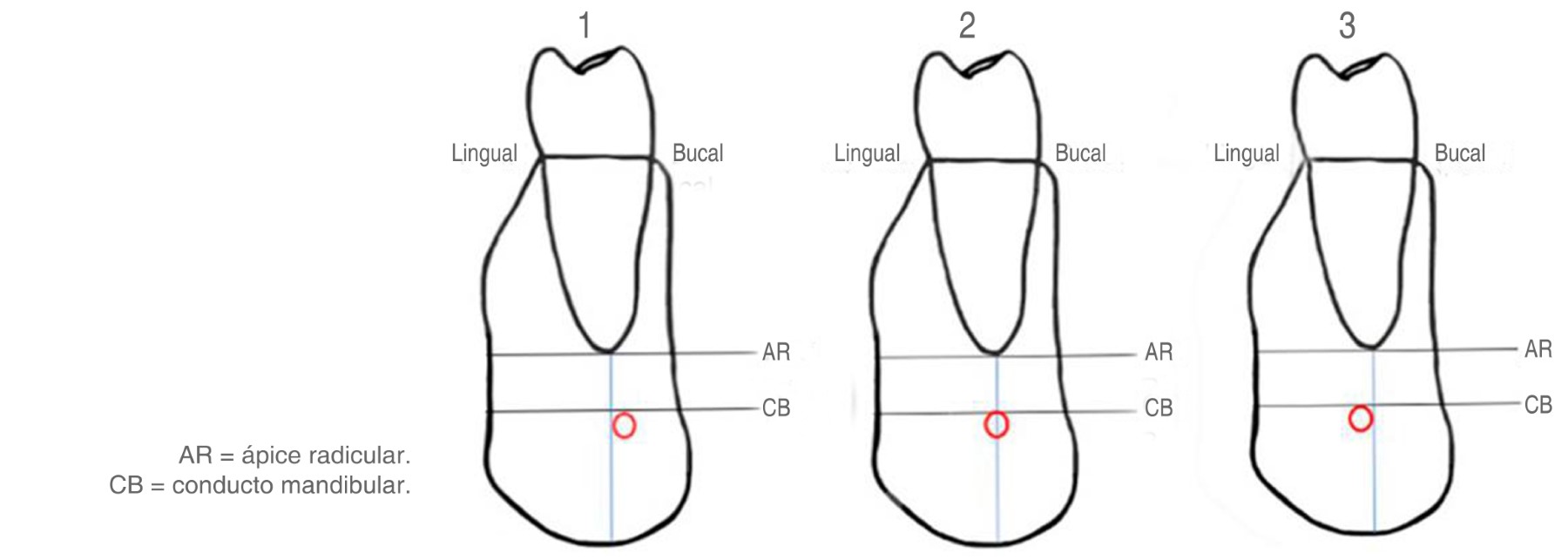 Para valorar la posición del conducto mandibular respecto a los ápices radiculares se realizaron cinco evaluaciones en diferentes niveles: segundo premolar, raíz mesial del primer molar, raíz distal del primer molar, raíz mesial del segundo molar y raíz distal del segundo molar.
