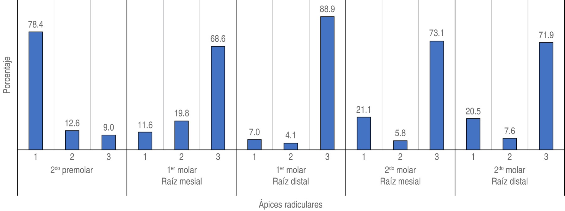 Respecto a la posición en sentido buco-lingual, se determinó que a nivel del segundo premolar, en la mayoría (78%) el conducto se encuentra en una posición bucal; a nivel del primer molar en su raíz mesial, en la mayoría (68.6%) el conducto se encuentra en una posición lingual; a nivel del primer molar en su raíz distal, en la mayoría (88.9%) el conducto se encuentra en una posición lingual; a nivel del segundo molar en su raíz mesial, en la mayoría (73.1.%) el conducto se encuentra en una posición lingual; a nivel del segundo molar en su raíz distal, en la mayoría (71.9%) el conducto se encuentra en una posición lingual (Figura 3).