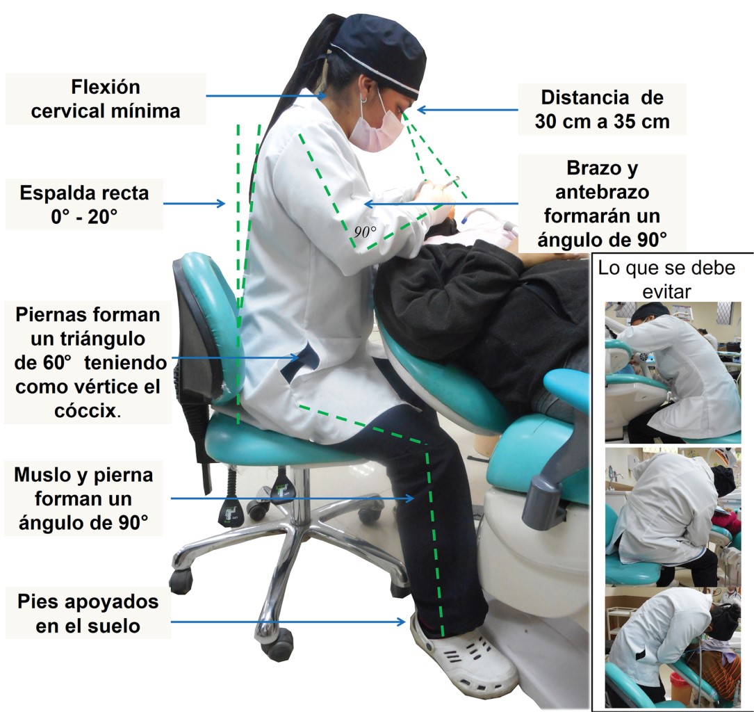 En la actualidad, la práctica de posturas inadecuadas y movimientos repetitivos, realizados para conseguir una mejor visibilidad del campo operatorio, son frecuentes, llevando al profesional al cansancio físico y mental. Una postura de trabajo incorrecta y conservada de forma prolongada, en conjunto con los años de práctica, originará patologías en el sistema musculoesquelético, con lo que sobresaldrán afecciones de la columna vertebral y de miembros superiores, por esto es importante conocer la posición de máximo equilibrio definida como la disposición del cuerpo, tronco, extremidades inferiores, cuello y cabeza que deben asegurar balance y estabilidad.1 Internacionalmente a esta disposición se le conoce como BHOP (Balanced Human Operating Position), su objetivo es evitar tensión muscular del esqueleto, al realizar un trabajo con la mayor cantidad de músculos en semirrelajación,2 ésta se caracteriza por mantener una espalda recta, en la cual la columna vertebral se encuentra perpendicular al paciente, los muslos paralelos al suelo y separados por un ángulo de 60o, las piernas estarán perpendiculares al suelo formando un ángulo de 90o a nivel de la rodilla, los brazos deben situarse perpendiculares al suelo, y junto con el antebrazo debe formarse un ángulo de 90o sin contactar al cuerpo (Figura 1).3