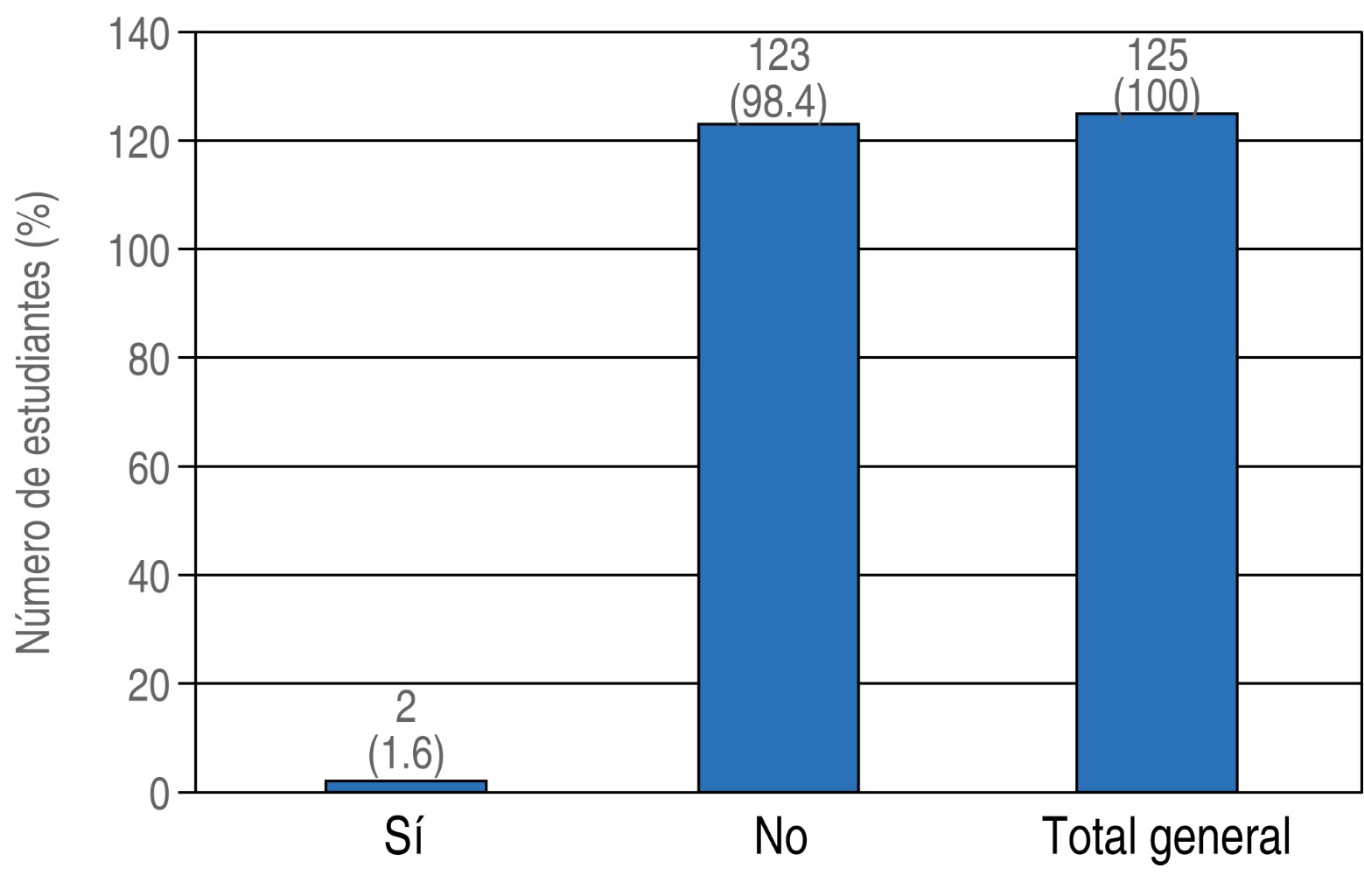 Se obtuvieron los siguientes resultados en la lista de verificación postural: de 125 estudiantes se pudo observar que sólo 1.6% (n = 2) posee una posición de máximo equilibrio, 98.4% (n = 123) no posee, por una u otra razón, una adecuada postura de trabajo (Figura 2).