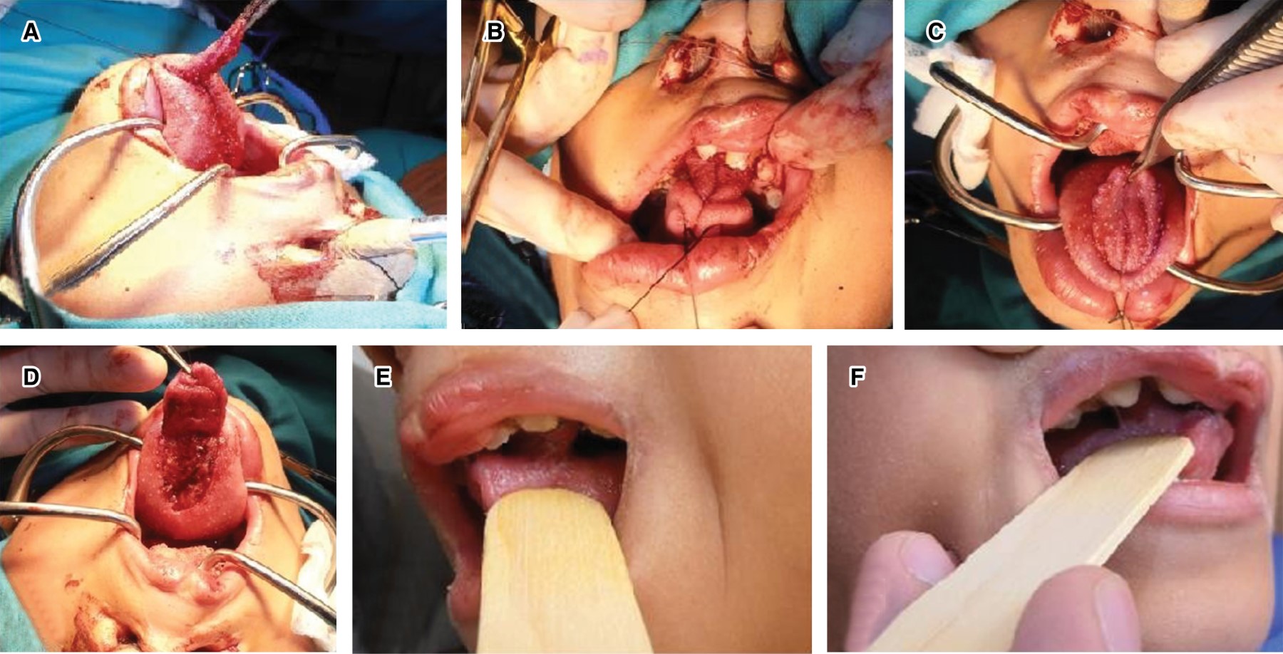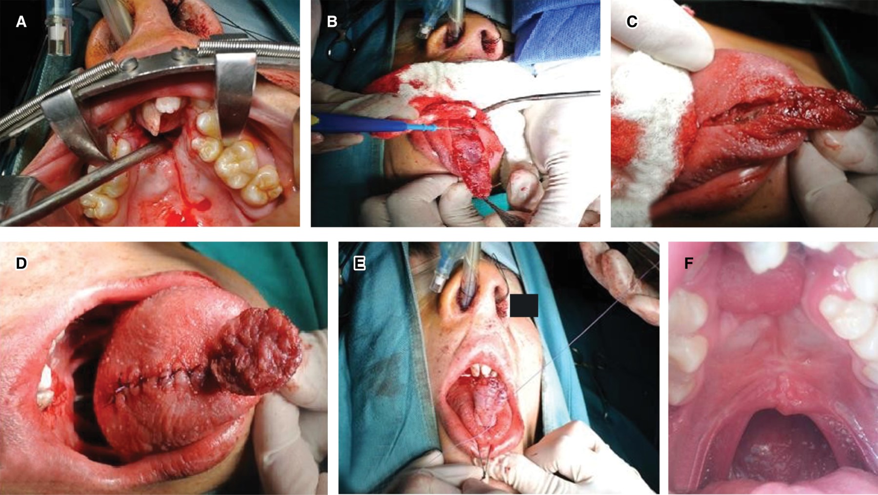 Paso 2: liberación del pedículo. El procedimiento para liberación de colgajo es complicado, ya que el paciente presenta una limitación de apertura oral, con un alto riesgo de que en el momento de la intubación sufra alguna complicación de la vía aérea. Esta intubación debe ser realizada por especialistas que manejen la nasofibroscopia, ya que el paciente debe ser intubado por la nariz y con nasofibroscopio. La liberación del pedículo es un corte sencillo que puede ser hecho con bisturí o electrobisturí, una consideración importante a ser tomada en cuenta es dejar en el paladar un tejido redundante que permita corregir cualquier defecto futuro (Figura 2A-C). Luego de la sutura del pedículo al sitio receptor, debe evitarse al máximo la tensión de estas suturas, por lo que se ha propuesto puntos de tensión primaria que sostengan los bordes laterales y la punta de la lengua, que evitará una posible dehiscencia de éste. El paciente deberá ser valorado en días posteriores para controlar la adecuada perfusión sanguínea de la zona trasplantada.