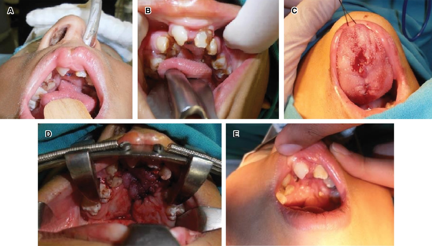 Caso clínico 2. Paciente de 14 años de edad de sexo masculino, con un diagnóstico de secuelas de LPF bilateral, no presenta antecedentes patológicos familiares, refiere que después del intento de varios procedimientos quirúrgicos presenta una comunicación oral y nasal, en el examen intraoral presenta una fístula nasopalatina anterior (Figura 3). Procedimiento quirúrgico para el cierre de fístula palatina.