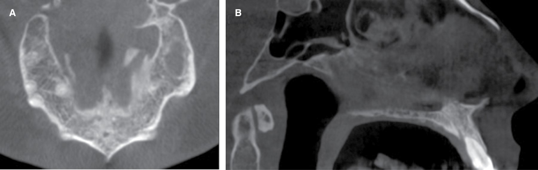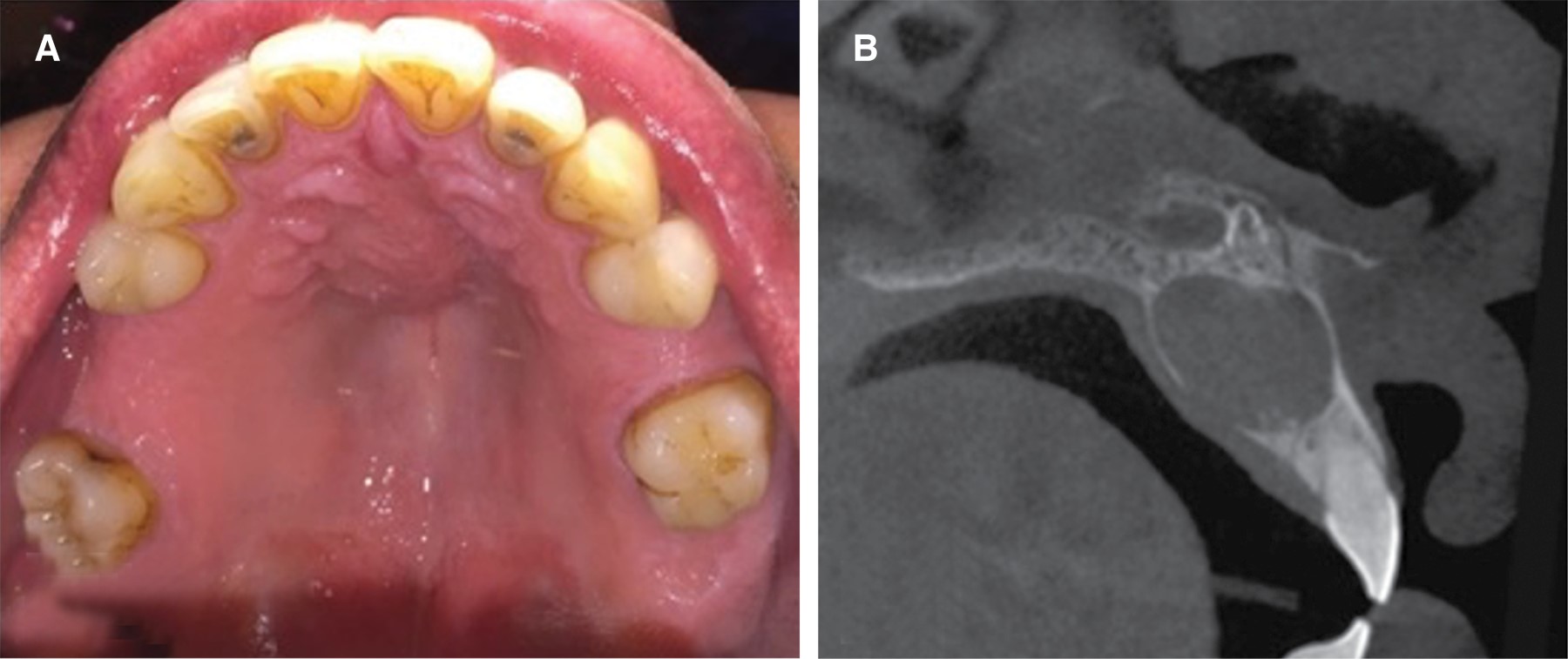 Paciente de género masculino de 43 años de edad consulta por aumento de volumen en paladar. Sin antecedentes sistémicos, relata dolor moderado, intermitente, localizado junto a sensación opresiva en sector anterosuperior maxilar, con tiempo de evolución desconocido. Al examen clínico se observa tumoración en fondo de vestíbulo y paladar, extendida desde 2.2 hasta 1.1, de forma redondeada, consistencia firme, cubierta por mucosa normal, doloroso a la palpación y de límites definidos. Los dientes involucrados presentaban caries, pero se encontraban vitales a las pruebas endodónticas y no presentaban movilidad ni desplazamiento (Figura 1A).