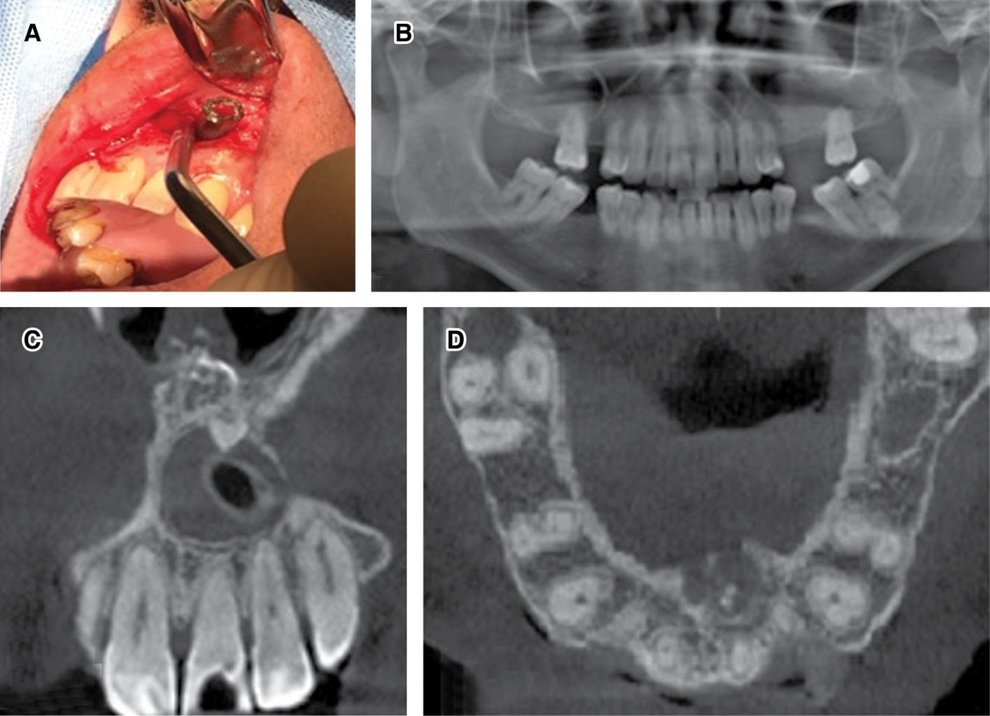 Posterior a consentimiento informado, se realiza biopsia incisional bajo anestesia local, donde se procede a instalar una cánula de descompresión con el objetivo de disminuir el tamaño de la lesión y se indicó aseo con clorhexidina al 0.12% tres veces al día con seguimiento radiográfico a los seis meses (Figura 2A). Con hipótesis diagnóstica de tumor odontogénico adenomatoide, las muestras obtenidas fueron enviadas a estudio histopatológico, el cual mostró una membrana quística con revestimiento epitelial escamoso no queratinizado, de pocas capas, focos de calcificaciones distróficas siendo características sugestivas de quiste dentígero. Tras seis meses de la intervención se realizó una nueva evaluación clínica e imagenológica, donde el paciente relató disminución del tamaño de la lesión y cese de sintomatología opresiva en relación con el sector anatómico comprometido, observándose radiográficamente una disminución del tamaño de la lesión quística en sector anterosuperior con un diámetro de 1.4 × 1.7 × 1.5 cm asociada a la presencia de cánula de descompresión en su espesor (Figura 2B-D).