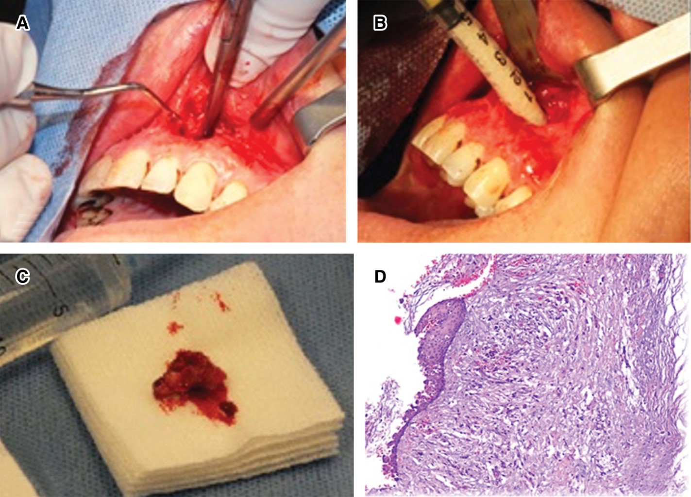 Se procedió a realizar una nueva intervención quirúrgica bajo anestesia local, donde se efectuó la enucleación y remoción quística con curetaje óseo con exodoncia de supernumerario. Finalmente se realiza relleno de cavidad con hueso microparticulado liofilizado xenogénico (Alpha Bio's GRAFT) más una membrana de colágeno reabsorbible (MEDPRIN ReDuraTM), suturando finalmente la mucosa comprometida (Figura 3A y B). La muestra obtenida (Figura 3C) fue enviada nuevamente a análisis histopatológico evidenciándose metaplasia de epitelio quístico escamoso no queratinizado, rodeado por una cápsula de tejido conjuntivo laxo con infiltrado inflamatorio crónico confirmando diagnóstico de quiste dentígero (Figura 3D). No se observaron recidivas tras seis meses de seguimiento de la lesión (Figura 4).