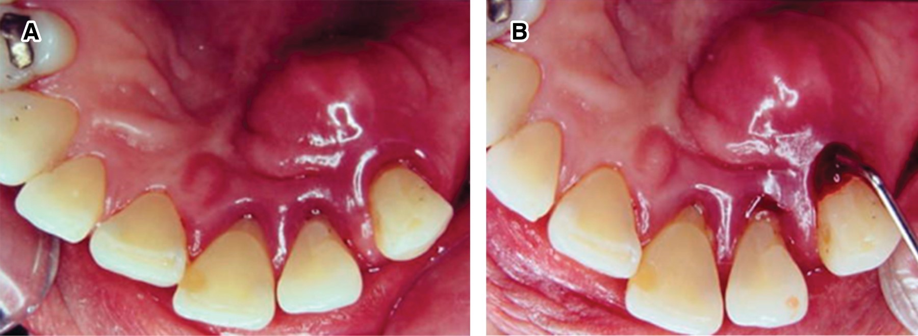 - i. Absceso periodontal en pacientes con periodontitis: representa la exacerbación de la enfermedad en un determinado sitio, favorecido por la existencia de bolsas profundas tortuosas, presencia de lesión en la furcación o un defecto vertical. El cierre marginal de la bolsa puede ocasionar mayor movilidad y extensión de la infección a tejidos periodontales circunvecinos. Se ha observado que los cambios en la composición de la microbiota subgingival producen mayor virulencia bacteriana, y que la disminución en los mecanismos de defensa del huésped podrían dar como resultado una capacidad disminuida para drenar la supuración (Figura 2A y B).