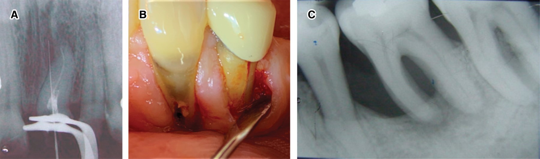 Para el diagnóstico de estas lesiones es importante conocer la historia del paciente en relación con la lesión, con el fin de identificar si se produjo algún trauma o lesión durante el tratamiento de conductos, o si hubo una lesión durante o después de la colocación de un poste intrarradicular. Si son identificados uno o más de estos eventos, se debe buscar en la examinación clínica y radiográfica la presencia de perforaciones (Figura 3A), fracturas radiculares (Figura 3B), fisuras o resorción radicular externa. En caso de no detectar perforaciones o fracturas debe procederse a la examinación en busca de una bolsa periodontal que esté próxima al ápice (Figura 3C).4