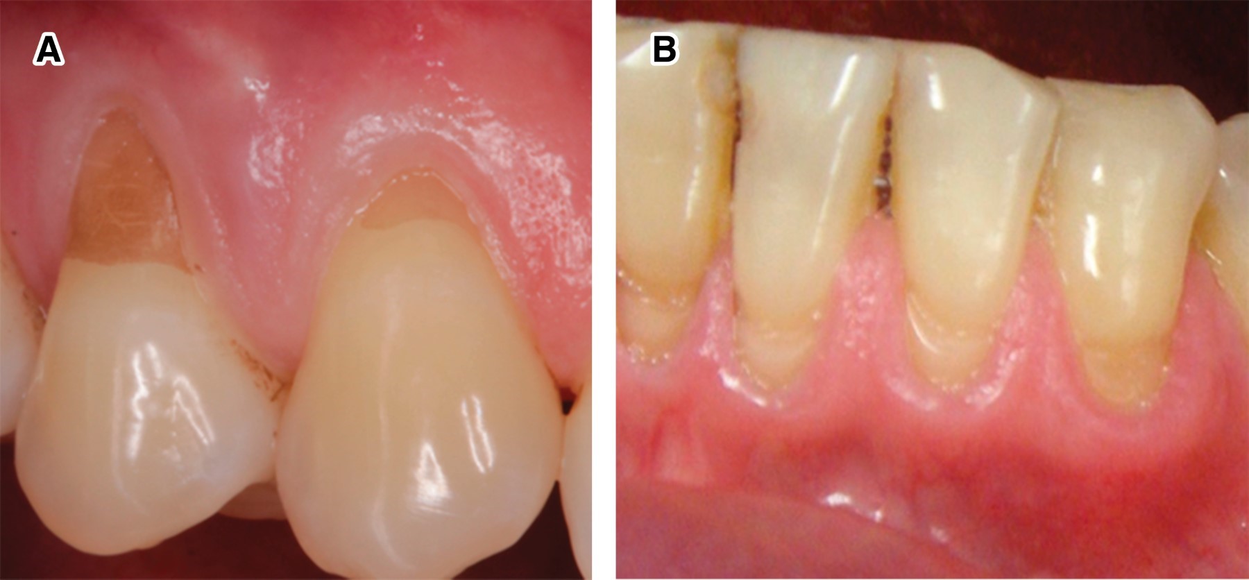 - g. Condición de la superficie radicular expuesta. Además de determinar el tipo de recesión gingival observada en el paciente, se sugiere realizar una lista de factores que afectan el resultado terapéutico, como el grosor gingival, ancho de tejido queratinizado, presencia o ausencia de lesiones cervicales no cariosas (Figura 6A) y la presencia o ausencia de la unión cemento-esmalte o de escalón sobre la superficie radicular (Figura 6B).7