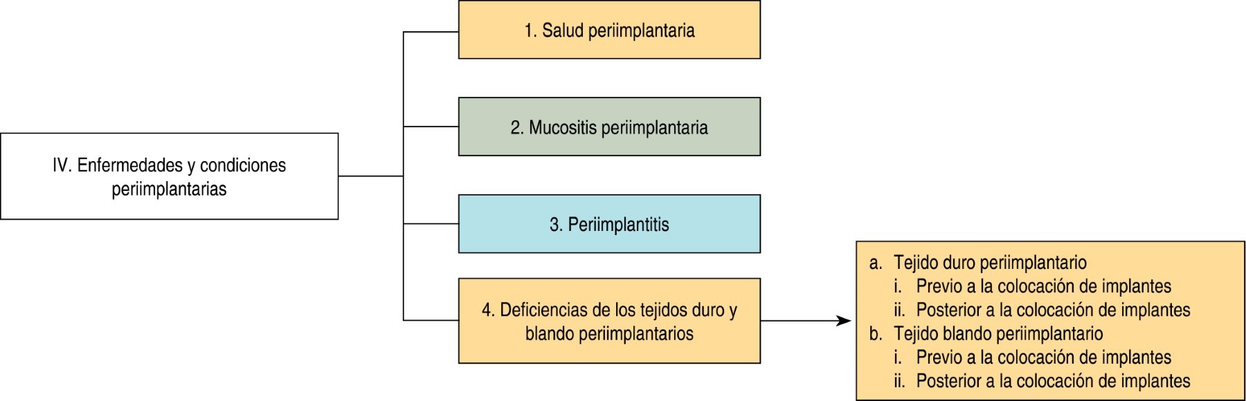 Los tejidos periimplantarios son aquellos que se forman alrededor de un implante dental oseointegrado. Se dividen en: tejido blando o mucosa periimplantaria y tejido duro formado por el hueso en íntimo contacto con la superficie del implante (oseointegración). En la Figura 7 se muestran las enfermedades y condiciones alrededor de los implantes dentales.