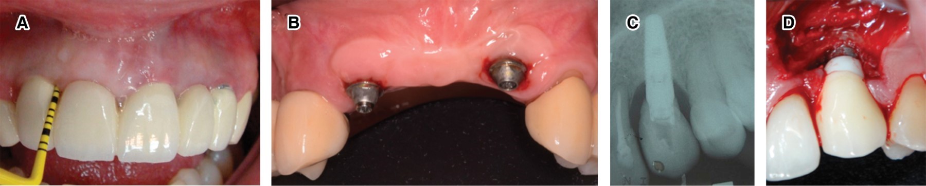Los sitios con periimplantitis muestran signos de inflamación, sangrado al sondeo y/o supuración, aumento en la profundidad al sondeo (en comparación con las mediciones obtenidas durante la colocación de la supraestructura), y/o recesión del margen de la mucosa periimplantaria. Esto es adicional a la pérdida ósea observada radiográficamente y comparada con examinaciones previas (Figura 8C y D).13