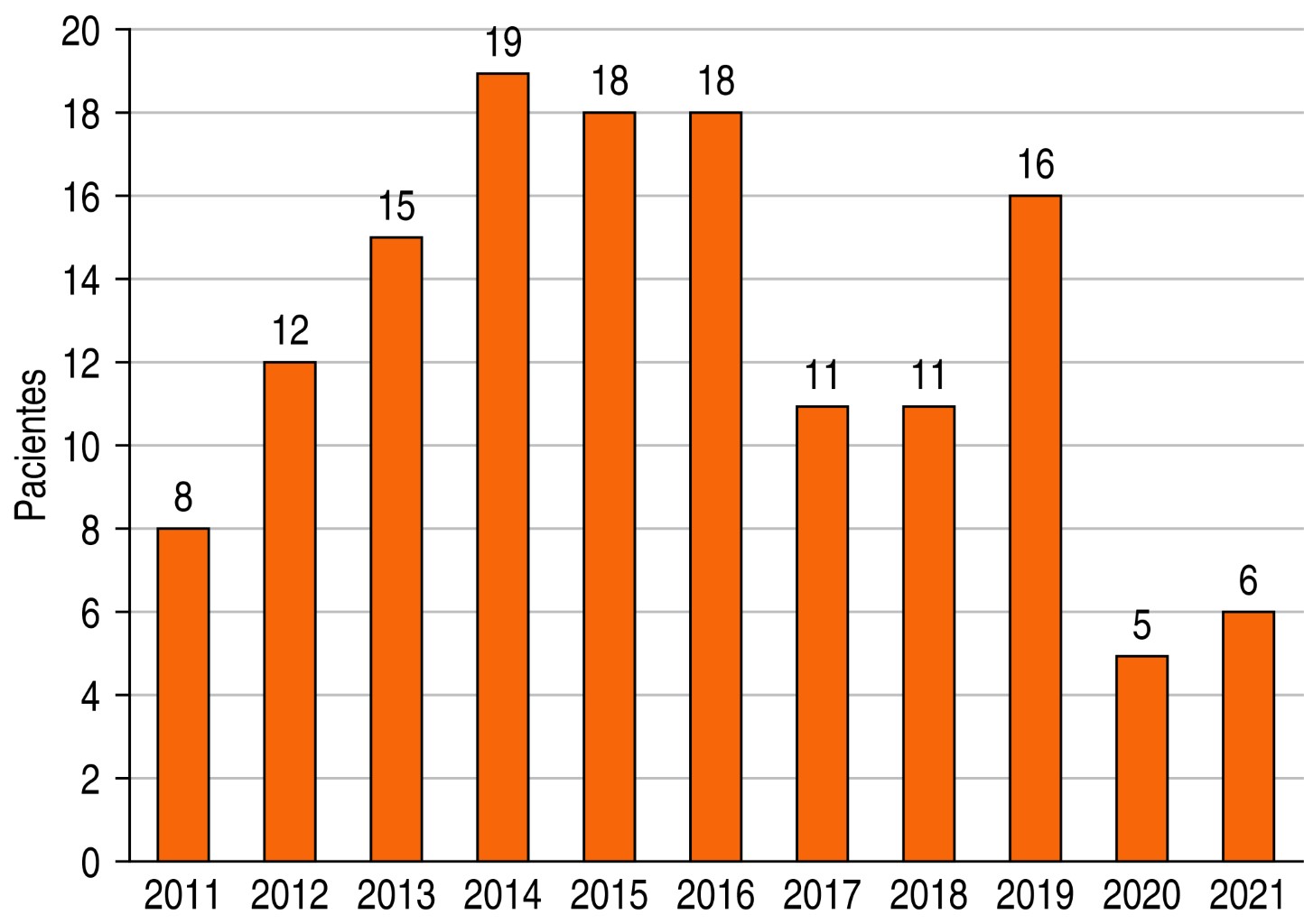 En la presente investigación se observaron los resultados siguientes, en la Figura 1 se muestra el número de pacientes intervenidos con esta anomalía por año, desde la gestión 2011 hasta la gestión 2021, resaltando que entre los años 2014 y 2016 más pacientes se operaron. De 139 casos observados, el sexo masculino representó 52.52% y el sexo femenino 47.48%; destacando que en las edades comprendidas entre 13 y 18 años se encontró la mayor cantidad de pacientes intervenidos.