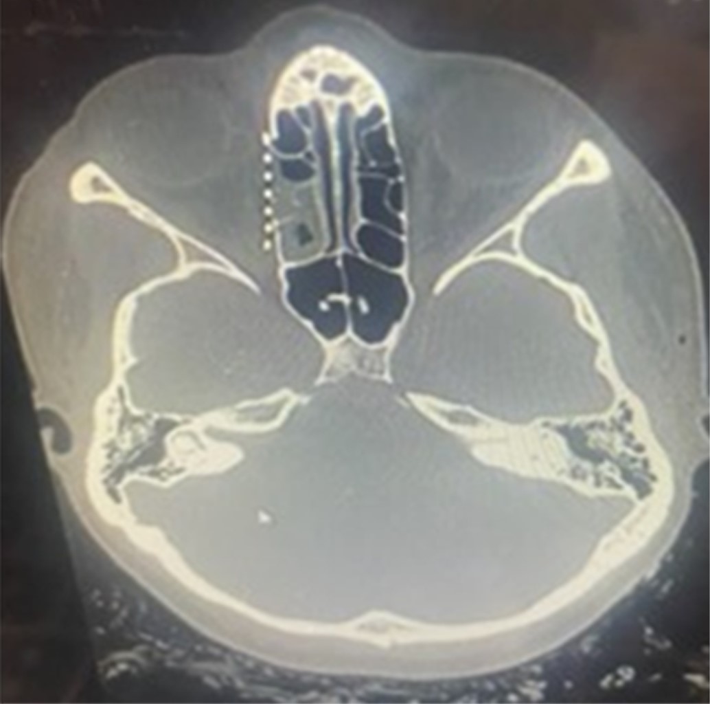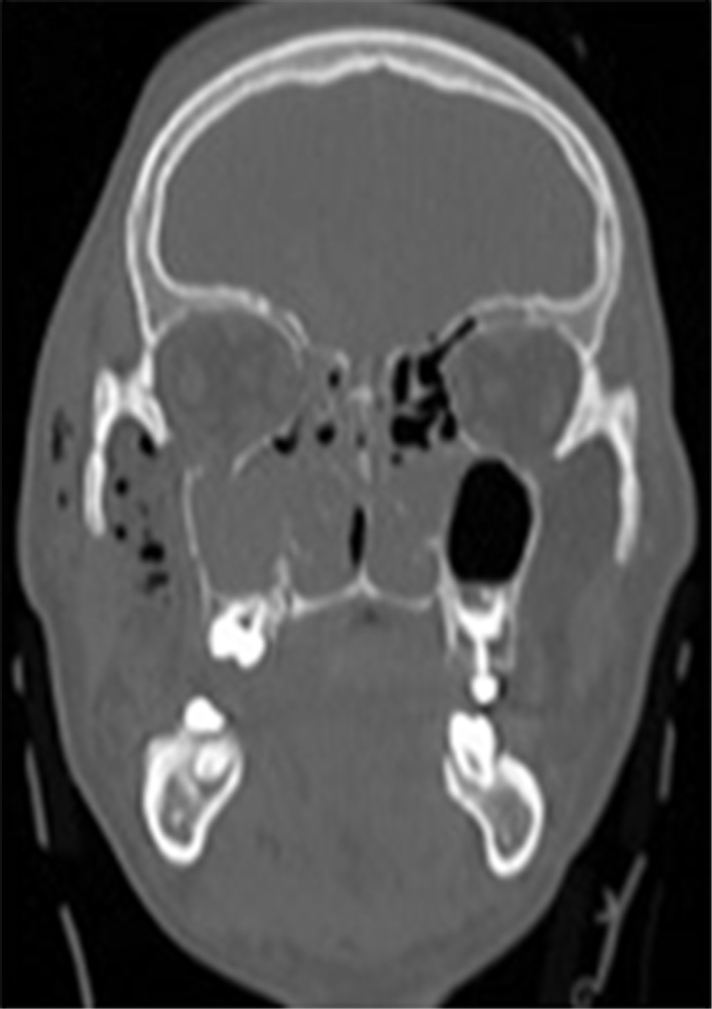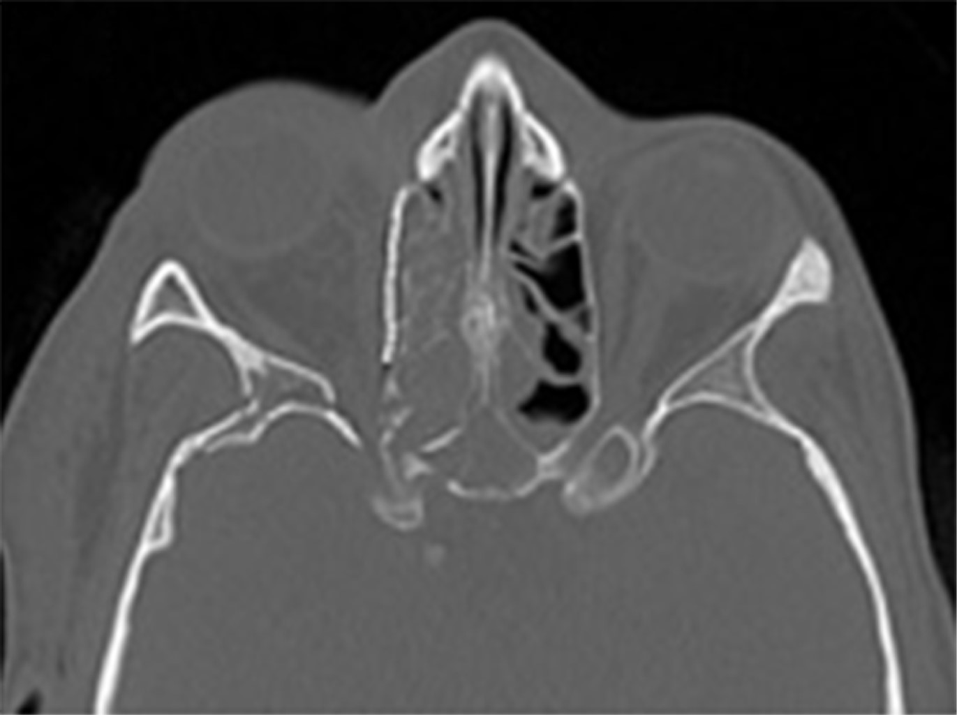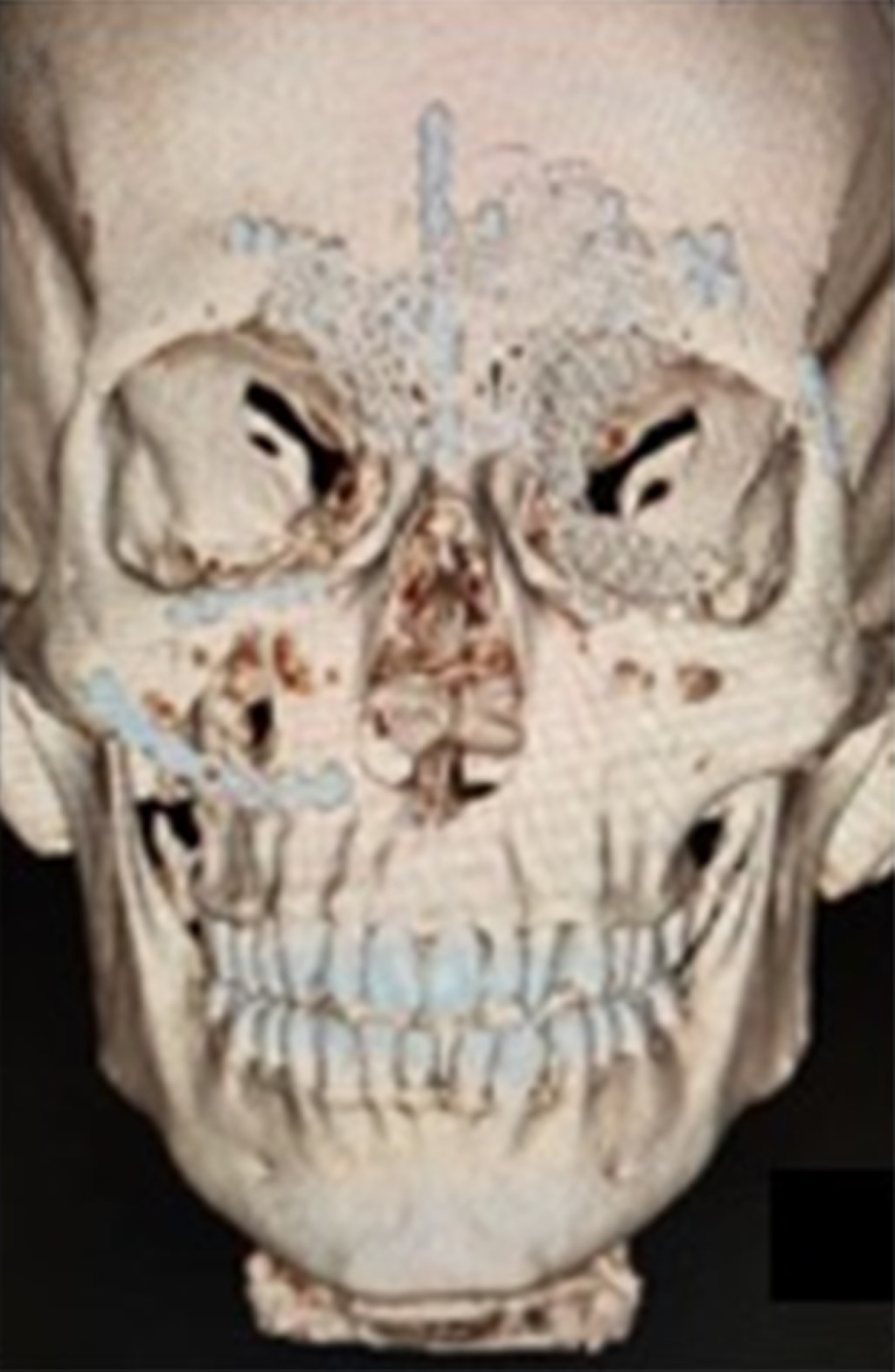 Una tomografía computarizada de la cara mostró una fractura de tipo Le Fort I del suelo, de la pared medial y del techo orbitario bilateral, fractura del cigomático derecho y de la pared anterior del hueso frontal.