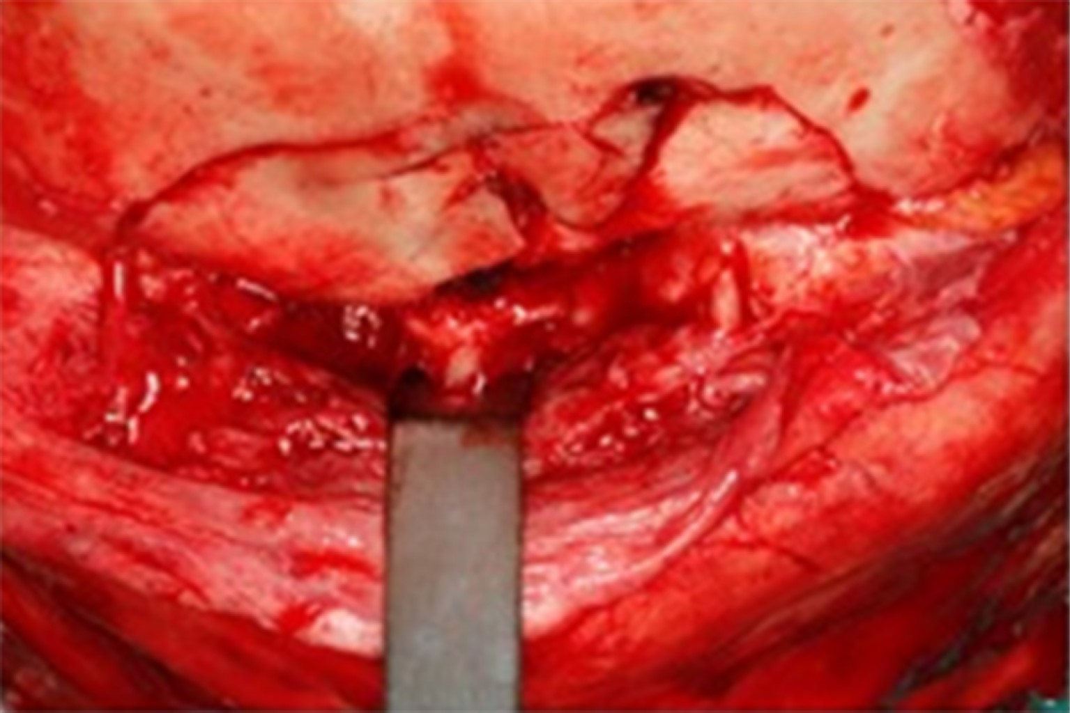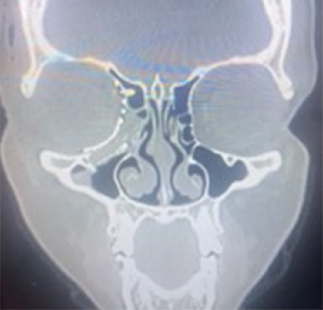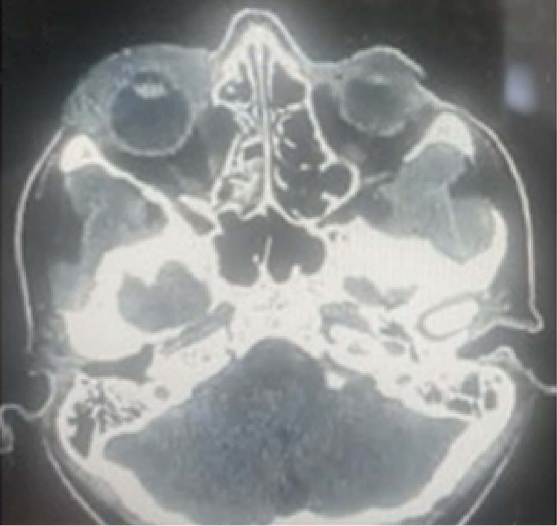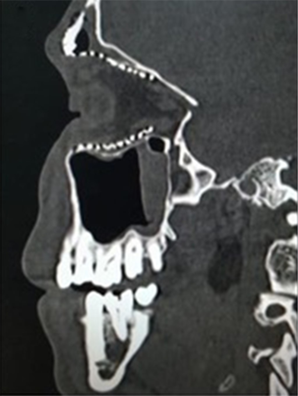 Una tomografía computarizada de la cara mostró una fractura de tipo Le Fort I del suelo, de la pared medial y del techo orbitario bilateral, fractura del cigomático derecho y de la pared anterior del hueso frontal.