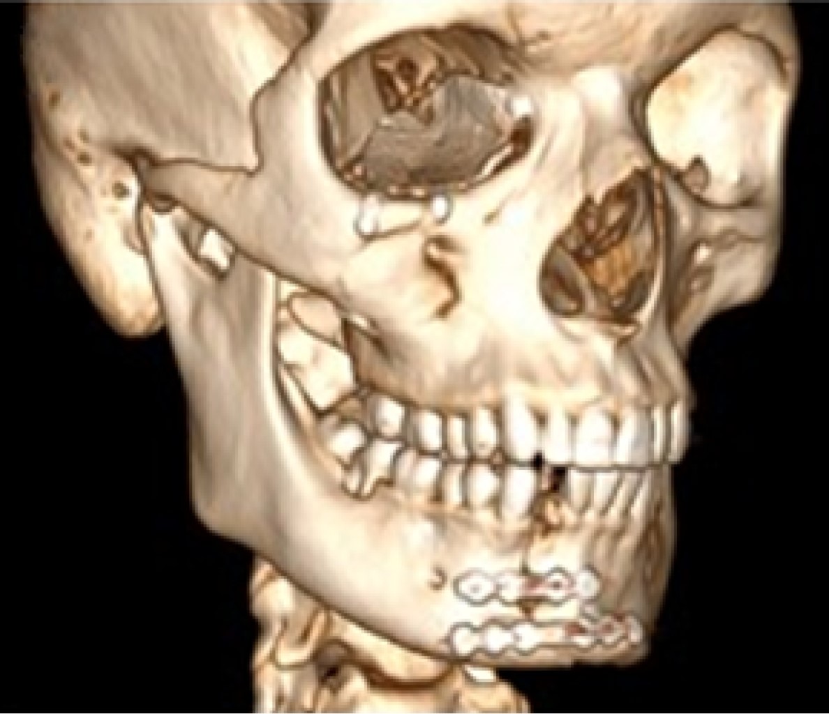 Paciente en seguimiento ambulatorio durante tres años sin quejas, se mantuvo clínicamente sin evidencia de infección ni complicación grave como diplopía y enoftalmia, buena proyección del cigomático derecho, sin cambios oculares ni intercurrencias durante este periodo postoperatorio (Figura 4).