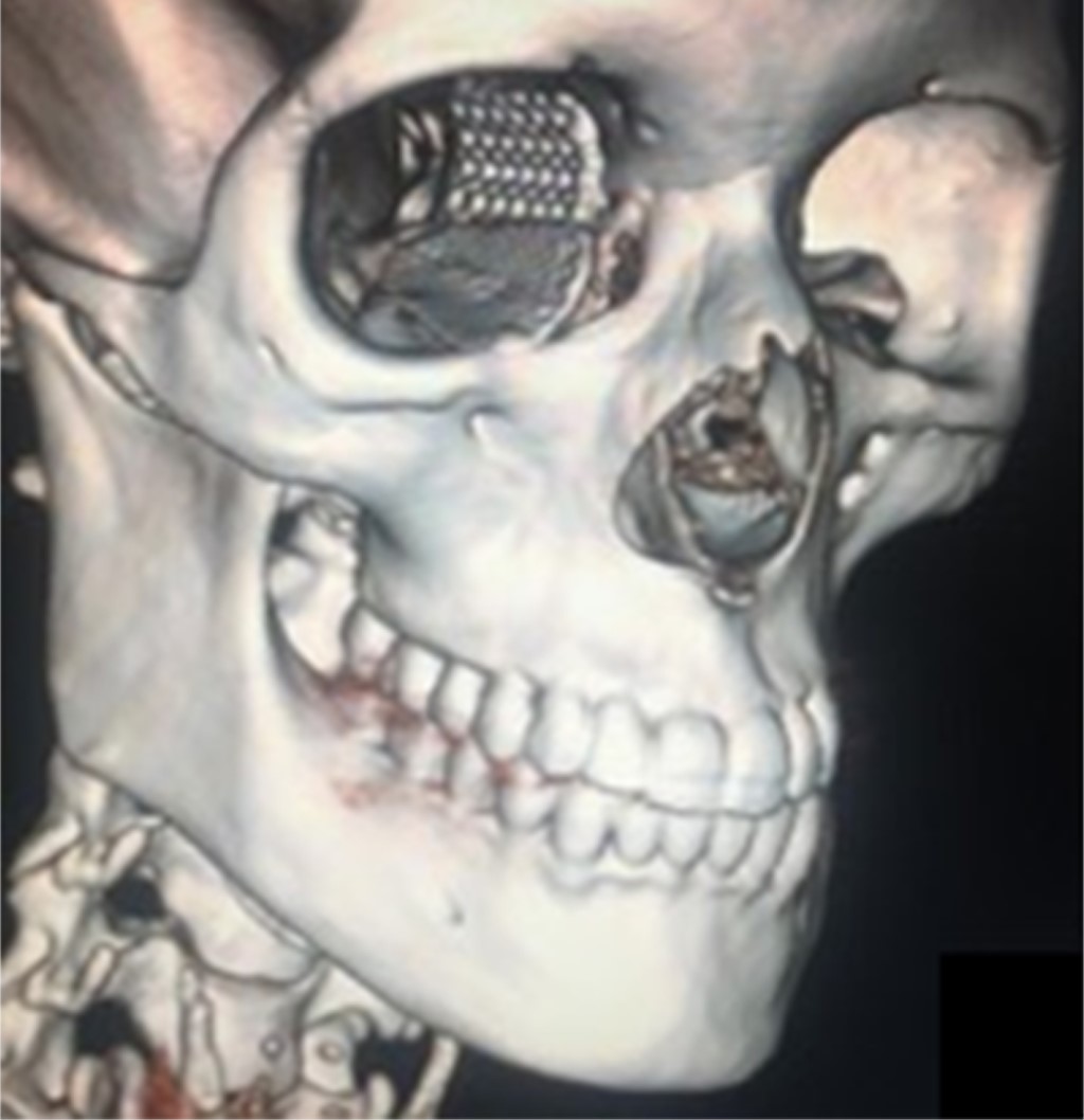 Paciente femenino de 35 años, víctima de un traumatismo de alta energía (patada de caballo), atendida por el equipo de Cirugía Oral y Maxilofacial y Traumatología de UNIMED Birugui. Presentaba un traumatismo en la región orbitaria derecha, que evolucionaba con signos clínicos de enoftalmia, distopía, hiposfagia y oftalmoplejía en lateralidad y supraversión, asociados a pérdida de agudeza visual.
