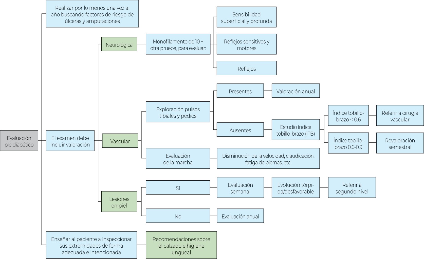 En este contexto, cuando se detecta un paciente diabético con factores de riesgo, está justificado realizar de forma sistémica, al momento del diagnóstico y de manera anual, la evaluación de las extremidades inferiores, con la finalidad de realizar un diagnóstico oportuno del pie diabético; dicha evaluación incluye la inspección del pie, la valoración del calzado y de la sensibilidad de las extremidades (monofilamento de 10 g, el biotensiómetro o prueba del diapasón); así como, la identificación de los pulsos pedios y tibiales; seguido del tamizaje de insuficiencia arterial periférica con el índice tobillo-brazo, entre otras acciones. En la Figura 2 se presenta un mapa a manera de resumen con las recomendaciones establecidas por la American Diabetes Association (ADA) y las Guías Prácticas del International Working Group on the Diabetic Foot 2019 (IWGDF, por sus siglas en inglés), para realizar una adecuada y completa valoración del paciente diabético y cuando se recomienda referir a segundo nivel.13,14