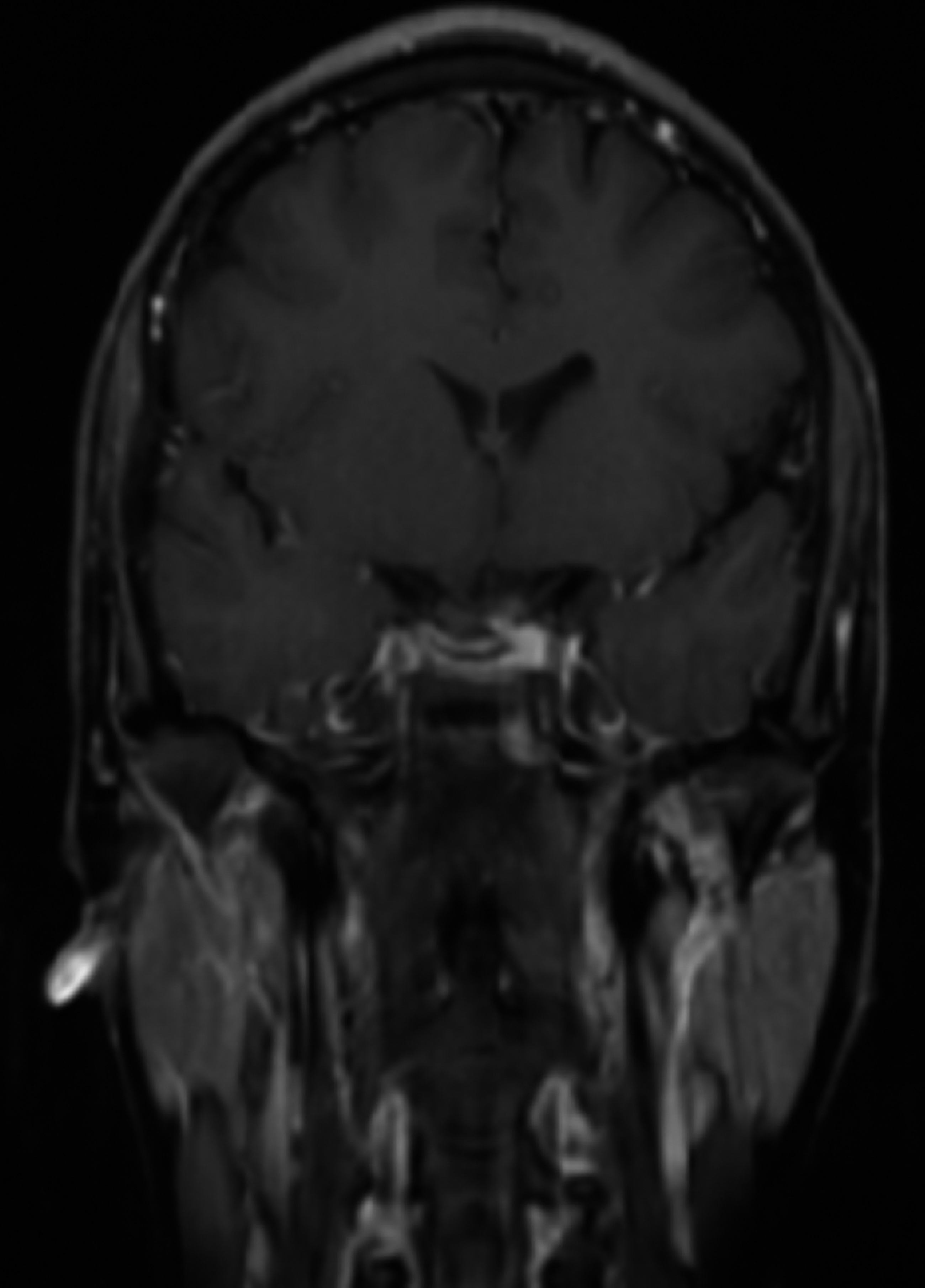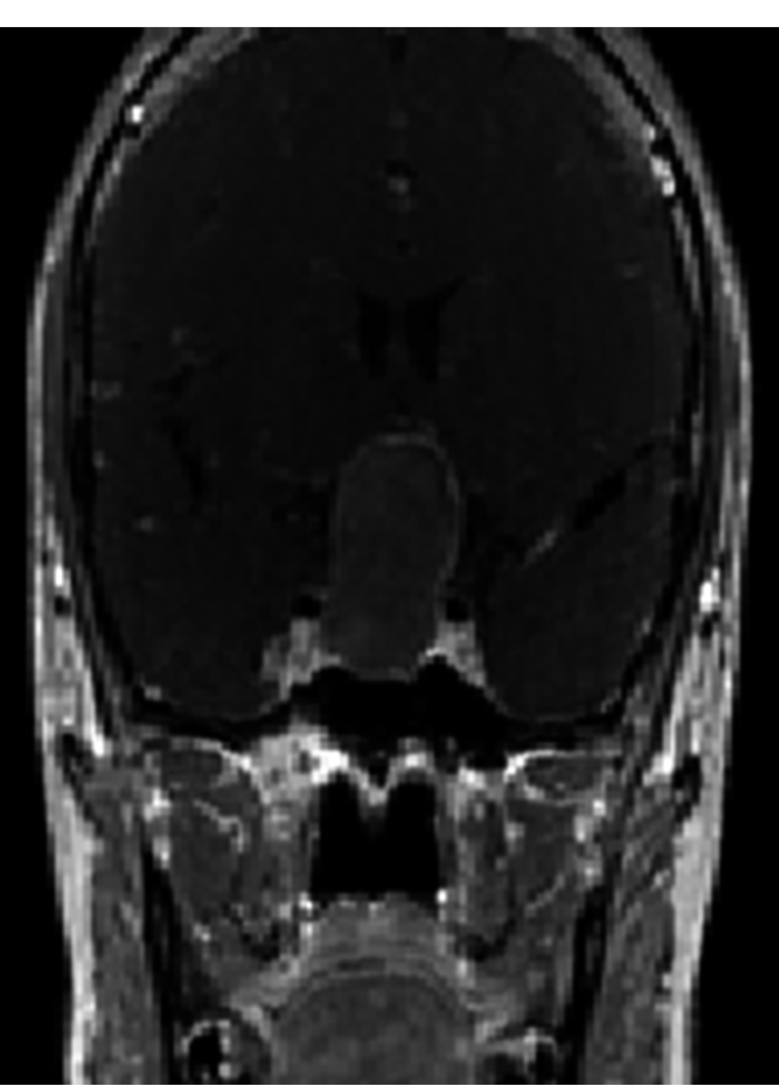 Se trata de mujer de 45 años que inició padecimiento en el 2018 con presencia de cefalea, fue tratada con analgésicos y hemianopsia bitemporal de predominio izquierdo, por lo que acudió a realizarse tomografía axial computarizada (TAC) simple y contrastada de cráneo, en donde se identificó lesión selar. Continuó con protocolo diagnóstico con imagen por resonancia magnética (IRM) de cráneo y se encontró lesión selar (Figura 5). Se inició protocolo preoperatorio solicitando los siguientes estudios: campimetría visual computarizada con hemianopsia bitemporal, perfil hormonal sin alteraciones, laboratorio paraclínico normal, radiografía de tórax, electrocardiograma normal y valoración preoperatoria por parte de los servicios de medicina interna y endocrinología para recibir recomendaciones sin contraindicación.