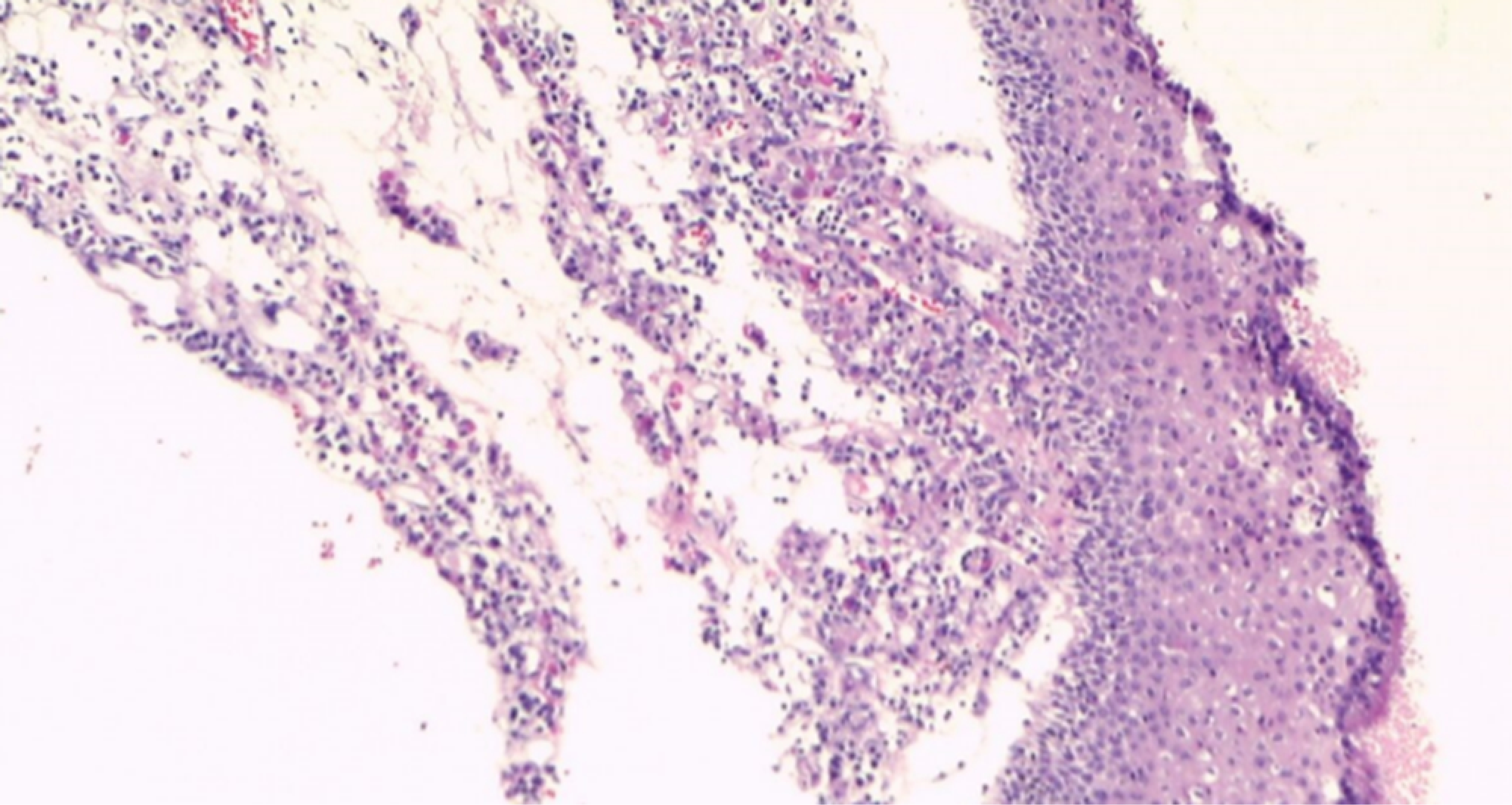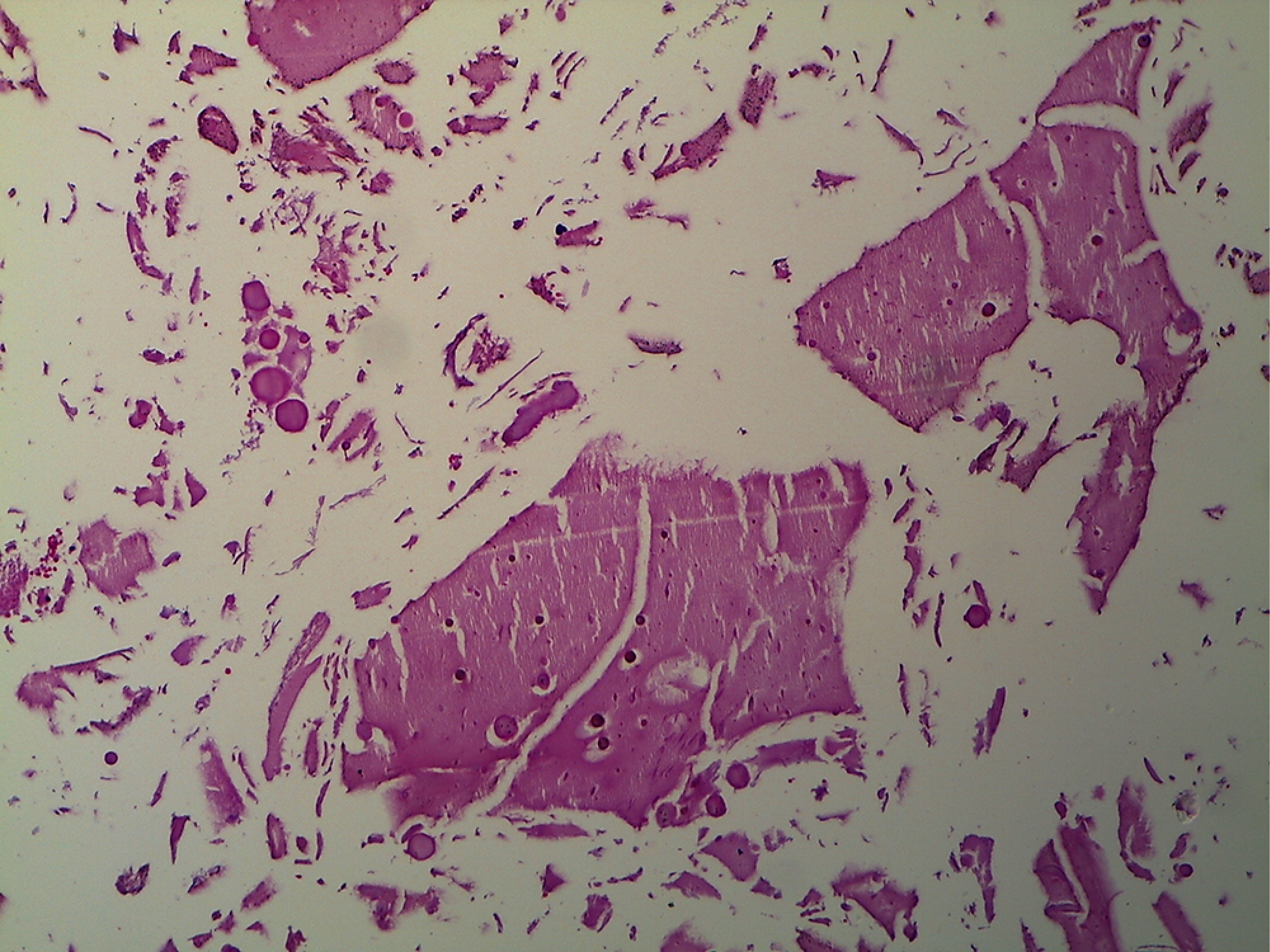 Tras completarse el protocolo de estudio con valoración por Servicio de Endocrinología, y sin contraindicación de evento quirúrgico, se programó para cirugía con diagnóstico presuntivo de adenoma hipofisario. Se realizó cirugía electiva el día 11 de marzo de 2016, a través de abordaje transesfenoidal directo, más resección de la lesión, más drenaje de absceso selar con hallazgos transoperatorios, lesión blanquecina aspirable, poco sangrante, de consistencia blanda y friable, acompañada de salida de material purulento y sangrado de 50 mililitros (Figura 2). Se enviaron muestras para cultivo de material, así como muestra a definitivo de lesión selar, con desarrollo bacteriano Staphylococcus aureus y reporte histopatológico de quiste de la bolsa de Rathke (Figuras 3 y 4). Se interconsulta al Servicio de Infectología que indica doble esquema de antibiótico a base de ceftriaxona y metronidazol.