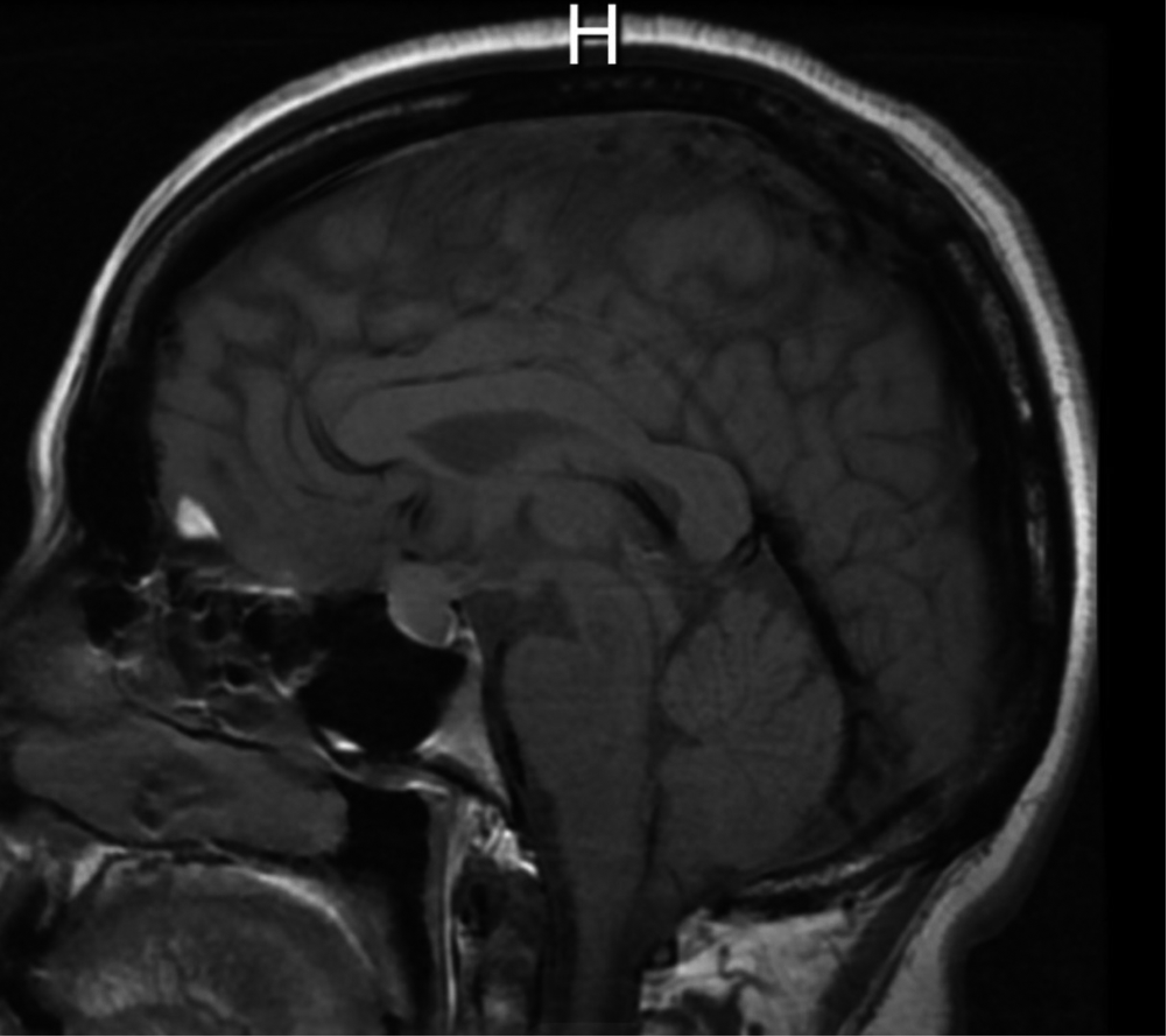 Se realizó resonancia magnética de cráneo ponderada en T1 y T2, T1 contrastado con gadolinio detectó lesión selar de bordes bien definidos, isointenso en relación con parénquima cerebral con realce en anillo tras administración de gadolinio, con diámetro 22 × 37 × 28 mm, se extiende hacia región supraselar sin compresión del tercer ventrículo, el resto sin alteraciones (Figura 1).