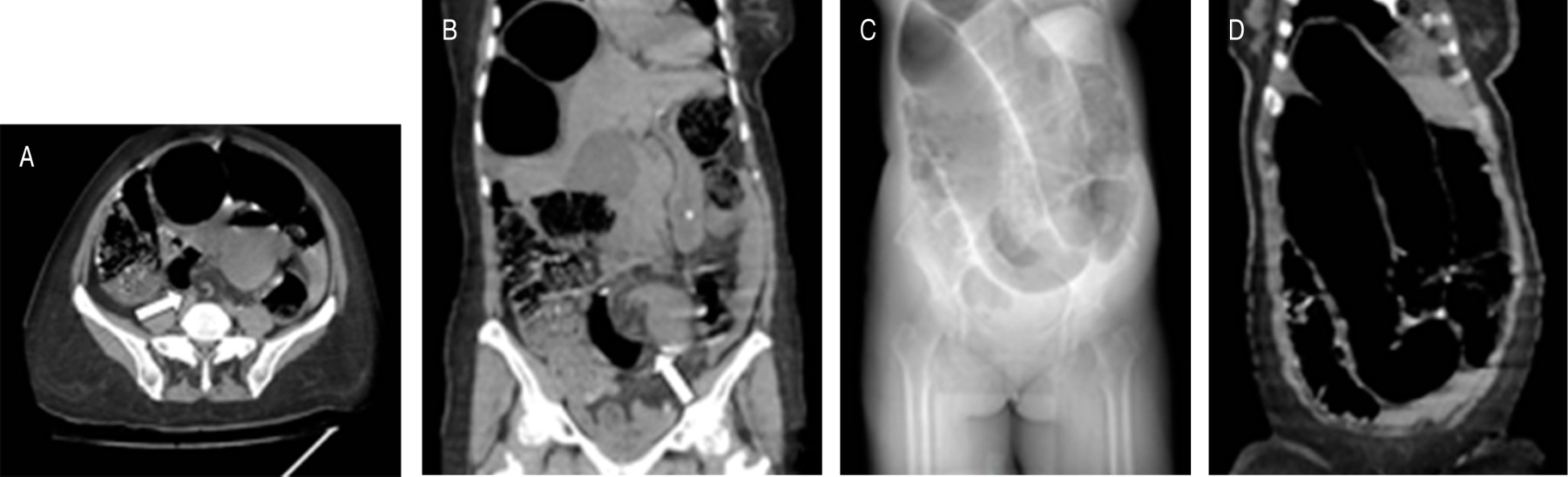 El estudio de elección es la tomografía computarizada debido a su sensibilidad de 100% y especificidad > 90%, debido a que permite crear reconstrucciones multiplanares que facilitan el diagnóstico definitivo.1 Los hallazgos son superiores a los de la radiografía simple; los signos específicos tanto de la tomografía como de la radiografía para vólvulos sigmoideo y colónico se muestran en la Tabla 2.3,11 No obstante, hasta 25% de los pacientes no presentaron estos signos característicos (Figura 1).