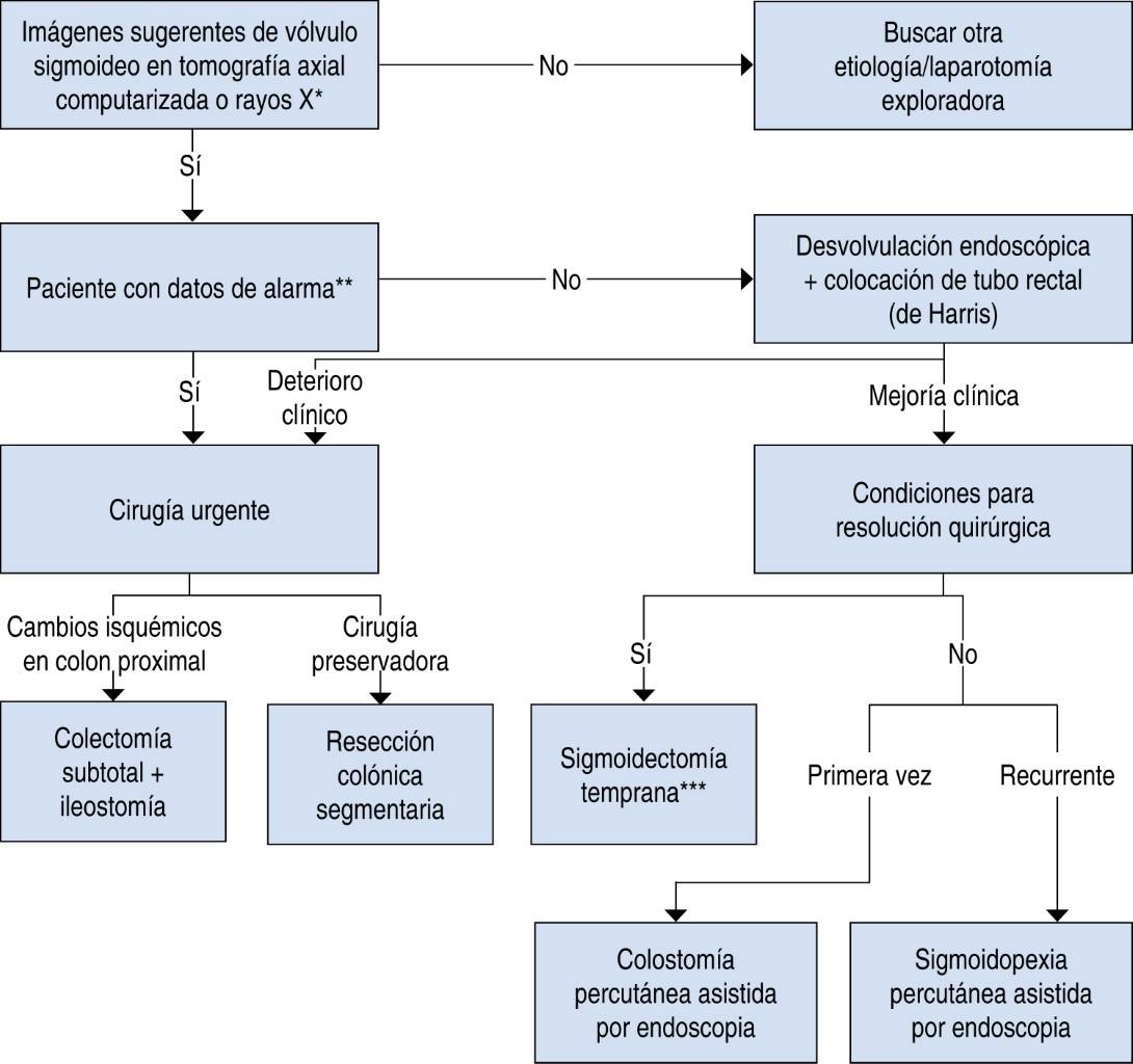 La sigmoidoscopia está indicada en pacientes hemodinámicamente estables; permite evaluar la viabilidad del colon y lograr la devolvulación con un índice de éxito de 70-95%, morbilidad de 4% y mortalidad de 3%. Se prefiere la endoscopia flexible por sobre la rígida.12 Después de la descompresión se coloca una sonda rectal por hasta 72 horas; en la actualidad, el consenso es realizar manejo quirúrgico resectivo-electivo de dos a cinco días después de la devolvulación endoscópica, por las altas tasas de recidiva (45-71%) en manejo endoscópico exclusivo, además de una mortalidad de 9 a 36% durante las mismas.12,13